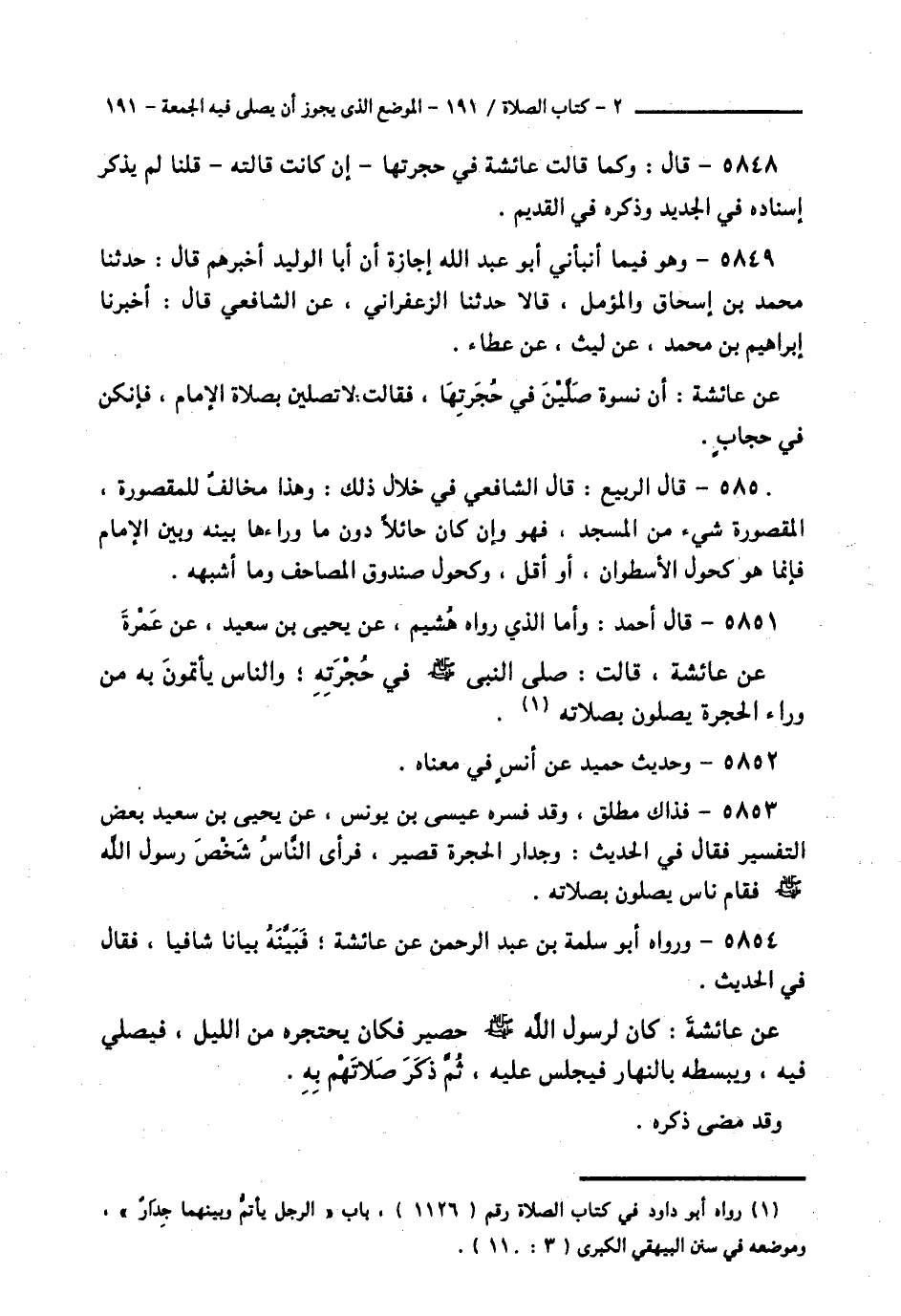 5851 - قَالَ أَحْمَدُ: وَأَمَّا الَّذِي رَوَاهُ هُشَيْمٌ، عَنْ يَحْيَى بْنِ سَعِيدٍ، عَنْ عَمْرَةَ، عَنْ عَائِشَةَ قَالَتْ: «صَلَّى النَّبِيُّ صَلَّى اللهُ عَلَيْهِ وَسَلَّمَ فِي حُجْرَتِهِ، وَالنَّاسُ يَأْتَمُّونَ بِهِ مِنْ وَرَاءِ الْحُجْرَةِ يُصَلُّونَ بِصَلَاتِهِ».