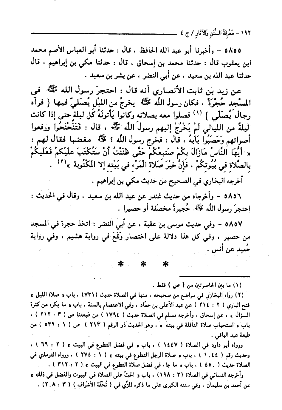 5855 - وَأَخْبَرَنَا أَبُو عَبْدِ اللَّهِ الْحَافِظُ قَالَ: حَدَّثَنَا أَبُو الْعَبَّاسِ الْأَصَمُّ مُحَمَّدُ بْنُ يَعْقُوبَ قَالَ: حَدَّثَنَا مُحَمَّدُ بْنُ إِسْحَاقَ قَالَ: حَدَّثَنَا مَكِّيُّ بْنُ إِبْرَاهِيمَ قَالَ حَدَّثَنَا عَبْدُ اللَّهِ بْنُ سَعِيدٍ، عَنْ أَبِي النَّضْرِ، عَنْ بِشْرِ بْنِ سَعِيدٍ، عَنْ زَيْدِ بْنِ ثَابِتٍ الْأَنْصَارِيِّ أَنَّهُ قَالَ: احْتَجَرَ رَسُولُ اللَّهِ صَلَّى اللهُ عَلَيْهِ وَسَلَّمَ فِي الْمَسْجِدِ حُجْرَةً، فَكَانَ رَسُولُ اللَّهِ صَلَّى اللهُ عَلَيْهِ وَسَلَّمَ يَخْرُجُ مِنَ اللَّيْلِ يُصَلِّي فِيهَا فَرَآهُ رِجَالٌ يُصَلِّي فَصَلَّوْا مَعَهُ بِصَلَاتِهِ وَكَانُوا يَأْتُونَهُ كُلَّ لَيْلَةٍ حَتَّى إِذَا كَانَتْ لَيْلَةٌ مِنَ اللَّيَالِي لَمْ يَخْرُجْ إِلَيْهِمْ رَسُولُ اللَّهِ صَلَّى اللهُ عَلَيْهِ وَسَلَّمَ، قَالَ: فَتَنَحْنَحُوا وَرَفَعُوا أَصْوَاتَهُمْ وَحَصَبُوا بَابَهُ قَالَ: فَخَرَجَ رَسُولُ اللَّهِ صَلَّى اللهُ عَلَيْهِ وَسَلَّمَ مُغْضَبًا، فَقَالَ لَهُمْ: § «أَيُّهَا النَّاسُ مَازَالَ بِكُمْ صَنِيعُكُمْ حَتَّى ظَنَنْتُ أَنْ سَتُكْتَبَ عَلَيْكُمْ فَعَلَيْكُمْ بِالصَّلَاةِ فِي بُيُوتِكُمْ؛ فَإِنَّ خَيْرَ صَلَاةِ الْمَرْءِ فِي بَيْتِهِ إِلَّا الْمَكْتُوبَةَ» أَخْرَجَهُ الْبُخَارِيُّ فِي الصَّحِيحِ مِنْ حَدِيثِ مَكِّيِّ بْنِ إِبْرَاهِيمَ
