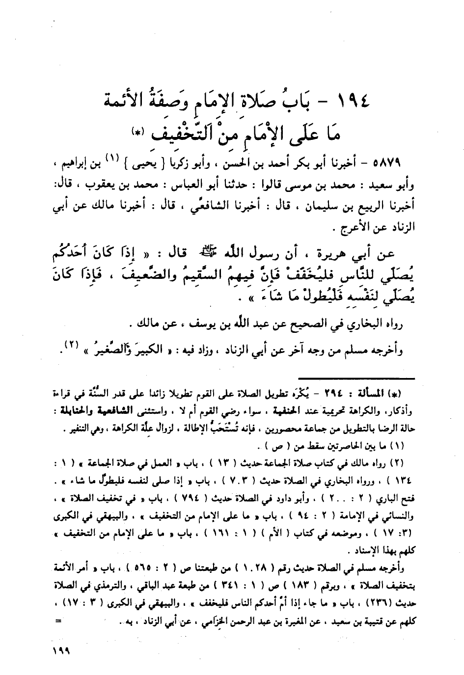 5879 - أَخْبَرَنَا أَبُو بَكْرٍ أَحْمَدُ بْنُ الْحَسَنِ، وَأَبُو زَكَرِيَّا يَحْيَى بْنُ إِبْرَاهِيمَ، وَأَبُو سَعِيدٍ مُحَمَّدُ بْنُ مُوسَى قَالُوا: حَدَّثَنَا أَبُو الْعَبَّاسِ مُحَمَّدُ بْنُ يَعْقُوبَ قَالَ: أَخْبَرَنَا الرَّبِيعُ بْنُ سُلَيْمَانَ قَالَ: أَخْبَرَنَا الشَّافِعِيُّ قَالَ: أَخْبَرَنَا مَالِكٌ، عَنْ أَبِي الزِّنَادِ، عَنِ الْأَعْرَجِ، عَنْ أَبِي هُرَيْرَةَ، أَنَّ رَسُولَ اللَّهِ صَلَّى اللهُ عَلَيْهِ وَسَلَّمَ قَالَ: § «إِذَا كَانَ أَحَدُكُمْ يُصَلِّي لِلنَّاسِ فَلْيُخَفِّفْ؛ فَإِنَّ فِيهِمُ السَّقِيمَ وَالضَّعِيفَ، فَإِذَا كَانَ يُصَلِّي لِنَفْسِهِ فَلْيُطَوِّلْ مَا شَاءَ» رَوَاهُ الْبُخَارِيُّ فِي الصَّحِيحِ، عَنْ عَبْدِ اللَّهِ بْنِ يُوسُفَ، عَنْ مَالِكٍ. وَأَخْرَجَهُ مُسْلِمٌ مِنْ وَجْهٍ آخَرَ، عَنْ أَبِي الزِّنَادِ، وَزَادَ فِيهِ: «الْكَبِيرَ وَالصَّغِيرَ» -[200]-.
