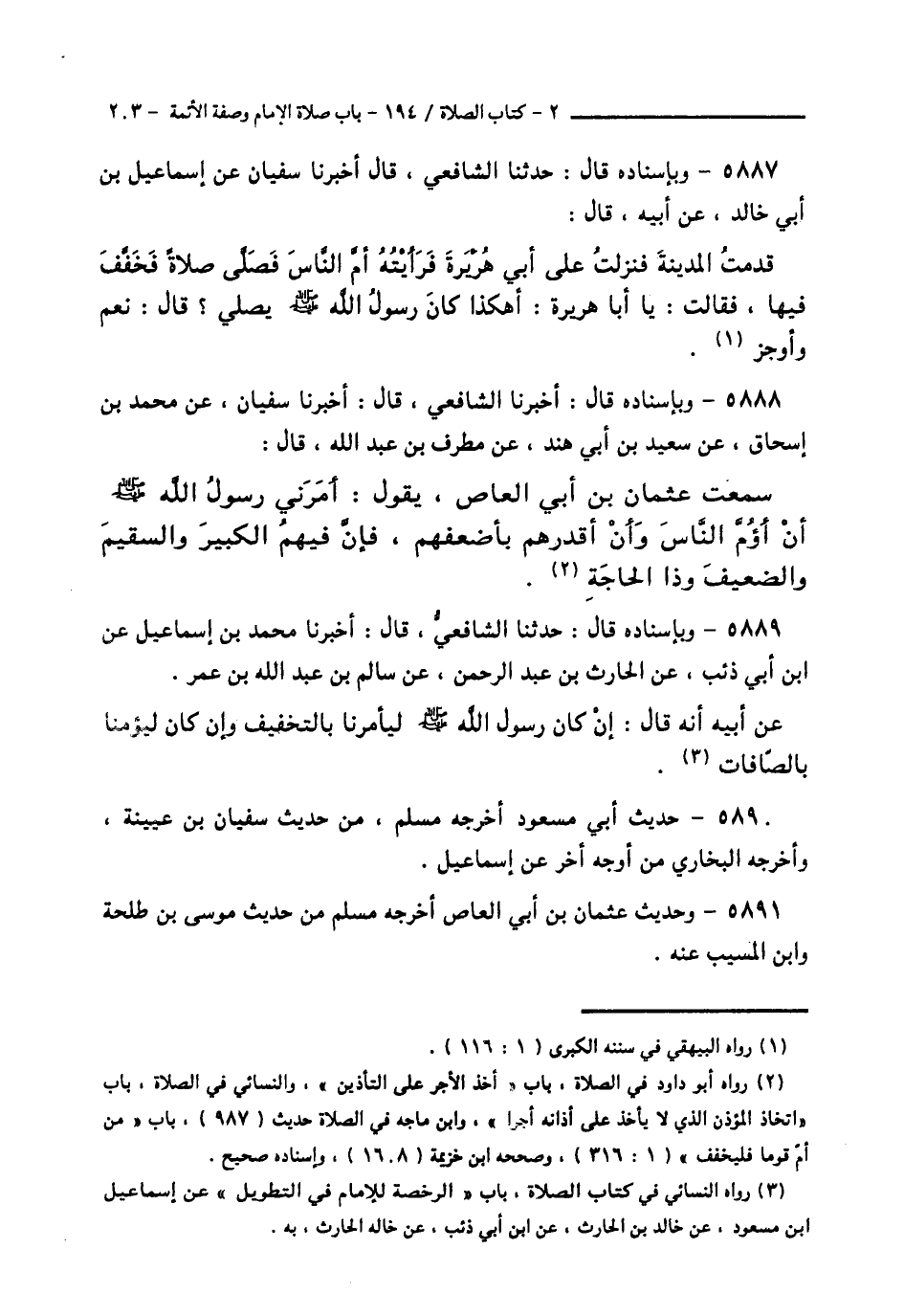 5887 - وَبِإِسْنَادِهِ قَالَ: حَدَّثَنَا الشَّافِعِيُّ قَالَ أَخْبَرَنَا سُفْيَانُ، عَنْ إِسْمَاعِيلَ بْنِ أَبِي خَالِدٍ، عَنْ أَبِيهِ قَالَ: قَدِمْتُ الْمَدِينَةَ فَنَزَلْتُ عَلَى أَبِي هُرَيْرَةَ فَرَأَيْتُهُ أَمَّ النَّاسَ، " §فَصَلَّى صَلَاةً فَخَفَّفَ فِيهَا، فَقُلْتُ: يَا أَبَا هُرَيْرَةَ: أَهَكَذَا كَانَ رَسُولُ اللَّهِ صَلَّى اللهُ عَلَيْهِ وَسَلَّمَ يُصَلِّي؟ قَالَ: نَعَمْ وَأَوْجَزَ "