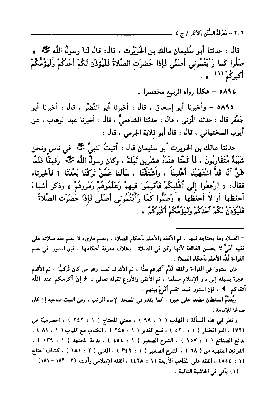 5895 - وَأَخْبَرَنَا أَبُو إِسْحَاقَ قَالَ: أَخْبَرَنَا أَبُو النَّضْرِ قَالَ: أَخْبَرَنَا أَبُو جَعْفَرٍ قَالَ: حَدَّثَنَا الْمُزَنِيُّ قَالَ: حَدَّثَنَا الشَّافِعِيُّ قَالَ: أَخْبَرَنَا عَبْدُ الْوَهَّابِ، عَنْ أَيُّوبَ السَّخْتِيَانِيِّ قَالَ: قَالَ أَبُو قِلَابَةَ الْجَرْمِيُّ قَالَ: حَدَّثَنَا مَالِكُ بْنُ الْحُوَيْرِثِ أَبُو سُلَيْمَانَ قَالَ: أَتَيْتُ النَّبِيَّ صَلَّى اللهُ عَلَيْهِ وَسَلَّمَ فِي نَاسٍ وَنَحْنُ شَبَبَةٌ مُتَقَارِبُونَ، فَأَقَمْنَا عِنْدَهُ عِشْرِينَ لَيْلَةً، وَكَانَ رَسُولُ اللَّهِ صَلَّى اللهُ عَلَيْهِ وَسَلَّمَ رَفِيقًا، فَلَمَّا ظَنَّ أَنَّا قَدِ اشْتَهَيْنَا أَهْلِينَا وَاشْتَقْنَا سَأَلَنَا عَمَّنْ تَرَكْنَا بَعْدَنَا؟ فَأَخْبَرْنَاهُ فَقَالَ: § «ارْجِعُوا إِلَى أَهْلِيكُمْ فَأَقِيمُوا فِيهِمْ وَعَلِّمُوهُمْ وَمُرُوهُمْ» - وَذَكَرَ أَشْيَاءَ أَحْفَظُهَا أَوْ لَا أَحْفَظُهَا - «وَصَلُّوا كَمَا رَأَيْتُمُونِي أُصَلِّي فَإِذَا حَضَرَتِ الصَّلَاةُ فَلْيُؤَذِّنْ لَكُمْ أَحَدُكُمْ وَلْيَؤُمَّكُمْ أَكْبَرُكُمْ» -[207]- رَوَاهُ مُسْلِمٌ فِي الصَّحِيحِ، عَنِ ابْنِ عُمَرَ، وَرَوَاهُ الْبُخَارِيُّ، عَنْ مُحَمَّدِ بْنِ مُثَنًّى، عَنْ عَبْدِ الْوَهَّابِ