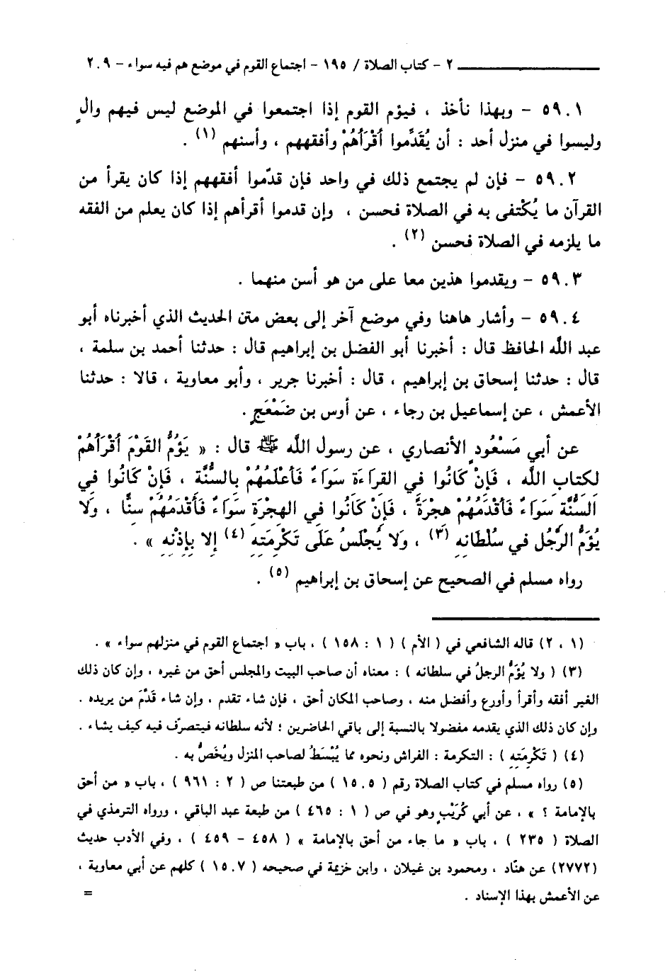 5904 - وَأَشَارَ هَاهُنَا وَفِي مَوْضِعٍ آخَرَ إِلَى بَعْضِ مَتْنِ الْحَدِيثِ الَّذِي أَخْبَرَنَاهُ أَبُو عَبْدِ اللَّهِ الْحَافِظُ قَالَ: أَخْبَرَنَا أَبُو الْفَضْلِ بْنُ إِبْرَاهِيمَ قَالَ: حَدَّثَنَا أَحْمَدُ بْنُ سَلَمَةَ قَالَ: حَدَّثَنَا إِسْحَاقُ بْنُ إِبْرَاهِيمَ قَالَ: أَخْبَرَنَا جَرِيرٌ، وَأَبُو مُعَاوِيَةَ قَالَا: حَدَّثَنَا الْأَعْمَشُ، عَنْ إِسْمَاعِيلَ بْنِ رَجَاءٍ، عَنْ أَوْسِ بْنِ ضَمْعَجٍ، عَنْ أَبِي مَسْعُودٍ الْأَنْصَارِيِّ، عَنْ رَسُولِ اللَّهِ صَلَّى اللهُ عَلَيْهِ وَسَلَّمَ قَالَ: § «يَؤُمُّ الْقَوْمَ أَقْرَؤُهُمْ لِكِتَابِ اللَّهِ. فَإِنْ كَانُوا فِي الْقِرَاءَةِ سَوَاءً فَأَعْلَمُهُمْ بِالسُّنَّةِ، فَإِنْ كَانُوا فِي السُّنَّةِ سَوَاءً فَأَقْدَمُهُمْ هِجْرَةً، فَإِنْ كَانُوا فِي الْهِجْرَةِ سَوَاءً فَأَقْدَمُهُمْ سِنًّا. وَلَا يُؤَمُّ الرَّجُلُ فِي سُلْطَانِهِ، وَلَا يُجْلَسُ عَلَى تَكْرِمَتِهِ إِلَّا بِإِذْنِهِ» رَوَاهُ مُسْلِمٌ فِي الصَّحِيحِ، عَنْ إِسْحَاقَ بْنِ إِبْرَاهِيمَ -[210]-