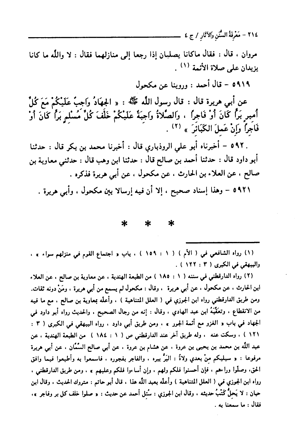 5919 - قَالَ أَحْمَدُ وَرُوِّينَا عَنْ مَكْحُولٍ، عَنْ أَبِي هُرَيْرَةَ قَالَ: قَالَ رَسُولُ اللَّهِ صَلَّى اللهُ عَلَيْهِ وَسَلَّمَ: § «الْجِهَادُ وَاجِبٌ عَلَيْكُمْ مَعَ كُلِّ أَمِيرٍ بَرًّا كَانَ أَوْ فَاجِرًا، وَالصَّلَاةُ وَاجِبَةٌ عَلَيْكُمْ خَلْفَ كُلِّ مُسْلِمٍ بَرًّا كَانَ أَوْ فَاجِرًا وَإِنْ عَمِلَ الْكَبَائِرَ»