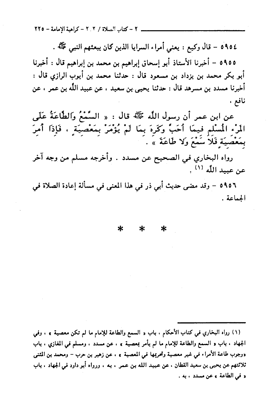 5955 - أَخْبَرَنَا الْأُسْتَاذُ أَبُو إِسْحَاقَ إِبْرَاهِيمُ بْنُ مُحَمَّدِ بْنِ إِبْرَاهِيمَ قَالَ: أَخْبَرَنَا أَبُو بَكْرٍ مُحَمَّدُ بْنُ يَزْدَادَ بْنِ مَسْعُودٍ قَالَ: حَدَّثَنَا مُحَمَّدُ بْنُ أَيُّوبَ الرَّازِيُّ قَالَ: أَخْبَرَنَا مُسَدَّدُ بْنُ مُسَرْهَدٍ قَالَ: حَدَّثَنَا يَحْيَى بْنُ سَعِيدٍ، عَنْ عُبَيْدِ اللَّهِ بْنِ عُمَرَ، عَنْ نَافِعٍ، عَنِ ابْنِ عُمَرَ، أَنَّ رَسُولَ اللَّهِ صَلَّى اللهُ عَلَيْهِ وَسَلَّمَ قَالَ: § «السَّمْعُ وَالطَّاعَةُ عَلَى الْمَرْءِ الْمُسْلِمِ فِيمَا أَحَبَّ وَكَرِهَ مَا لَمْ يُؤْمَرْ بِمَعْصِيَةٍ، فَإِذَا أُمِرَ بِمَعْصِيَةٍ فَلَا سَمْعَ وَلَا طَاعَةَ» رَوَاهُ الْبُخَارِيُّ فِي الصَّحِيحِ، عَنْ مُسَدَّدٍ. وَأَخْرَجَهُ مُسْلِمٌ مِنْ وَجْهٍ آخَرَ، عَنْ عُبَيْدِ اللَّهِ