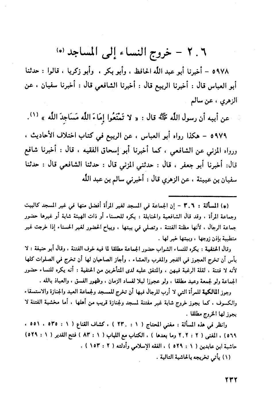 5978 - أَخْبَرَنَا أَبُو عَبْدِ اللَّهِ الْحَافِظُ، وَأَبُو بَكْرٍ، وَأَبُو زَكَرِيَّا قَالُوا: حَدَّثَنَا أَبُو الْعَبَّاسِ قَالَ: أَخْبَرَنَا الرَّبِيعُ قَالَ: أَخْبَرَنَا الشَّافِعِيُّ قَالَ: أَخْبَرَنَا سُفْيَانُ، عَنِ الزُّهْرِيِّ، عَنْ سَالِمِ، عَنْ أَبِيهِ، أَنَّ رَسُولَ اللَّهِ صَلَّى اللهُ عَلَيْهِ وَسَلَّمَ قَالَ: § «لَا تَمْنَعُوا إِمَاءَ اللَّهِ مَسَاجِدَ اللَّهِ»