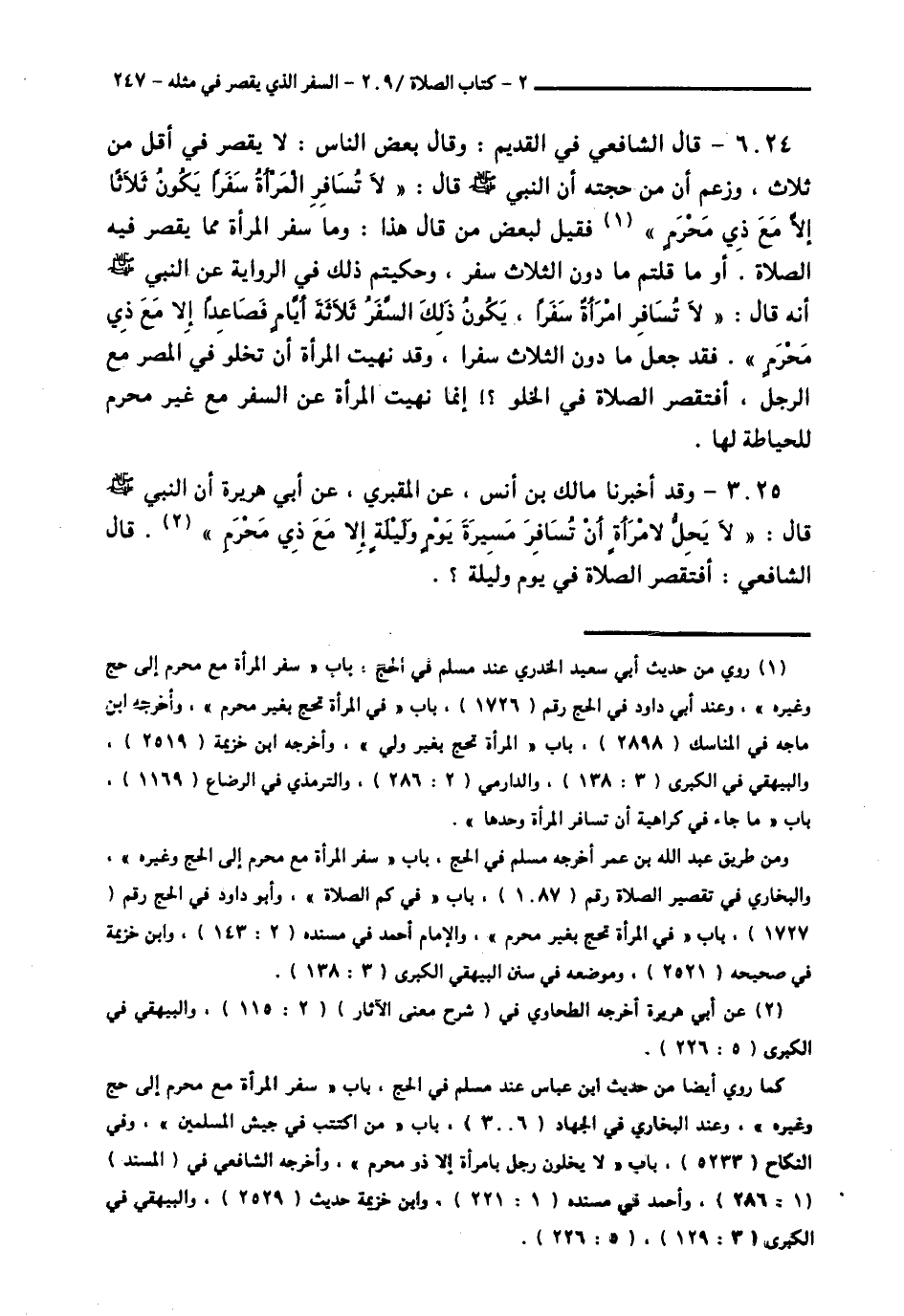 6025 - وَقَدْ أَخْبَرَنَا مَالِكُ بْنُ أَنَسٍ، عَنِ الْمَقْبُرِيِّ، عَنْ أَبِي هُرَيْرَةَ، أَنَّ النَّبِيَّ صَلَّى اللهُ عَلَيْهِ وَسَلَّمَ قَالَ: § «لَا يَحِلُّ لِامْرَأَةٍ أَنْ تُسَافِرَ مَسِيرَةَ يَوْمٍ وَلَيْلَةٍ إِلَّا مَعَ ذِي مَحْرَمٍ» قَالَ الشَّافِعِيُّ: أَفَتَقْصُرُ الصَّلَاةَ فِي يَوْمٍ وَلَيْلَةٍ؟ -[248]-