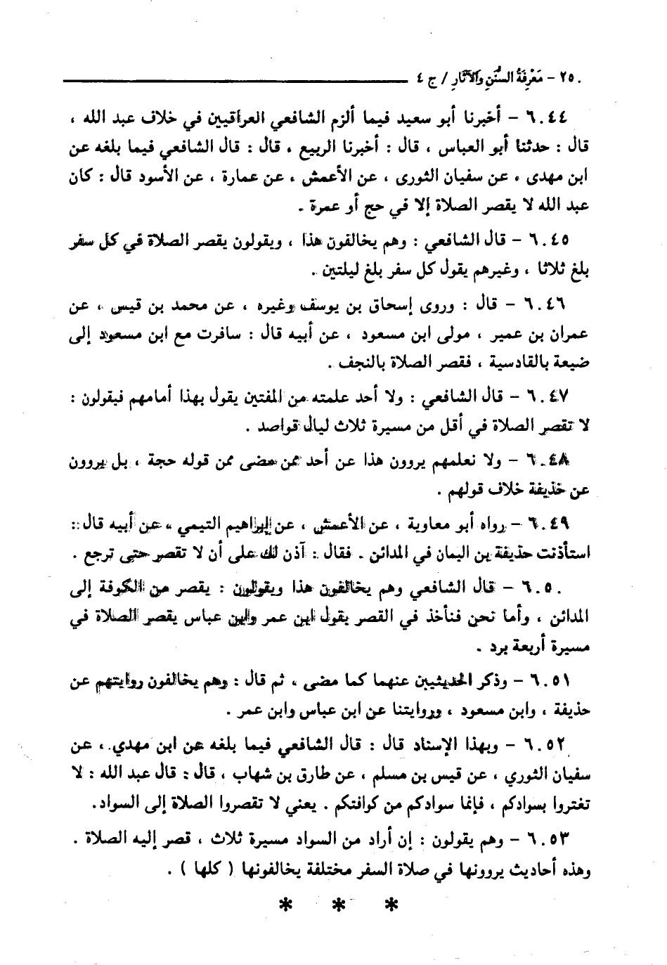 6044 - أَخْبَرَنَا أَبُو سَعِيدٍ فِيمَا أَلْزَمَ الشَّافِعِيُّ الْعِرَاقِيِّينَ فِي خِلَافِ عَبْدِ اللَّهِ قَالَ: حَدَّثَنَا أَبُو الْعَبَّاسِ قَالَ: أَخْبَرَنَا الرَّبِيعُ قَالَ: قَالَ الشَّافِعِيُّ فِيمَا بَلَغَهُ عَنِ ابْنِ مَهْدِيٍّ، عَنْ سُفْيَانَ الثَّوْرِيِّ، عَنِ الْأَعْمَشِ، عَنْ عُمَارَةَ، عَنِ الْأَسْوَدِ قَالَ: كَانَ عَبْدُ اللَّهِ § «لَا يَقْصُرُ الصَّلَاةَ إِلَّا فِي حَجٍّ أَوْ عُمْرَةٍ»