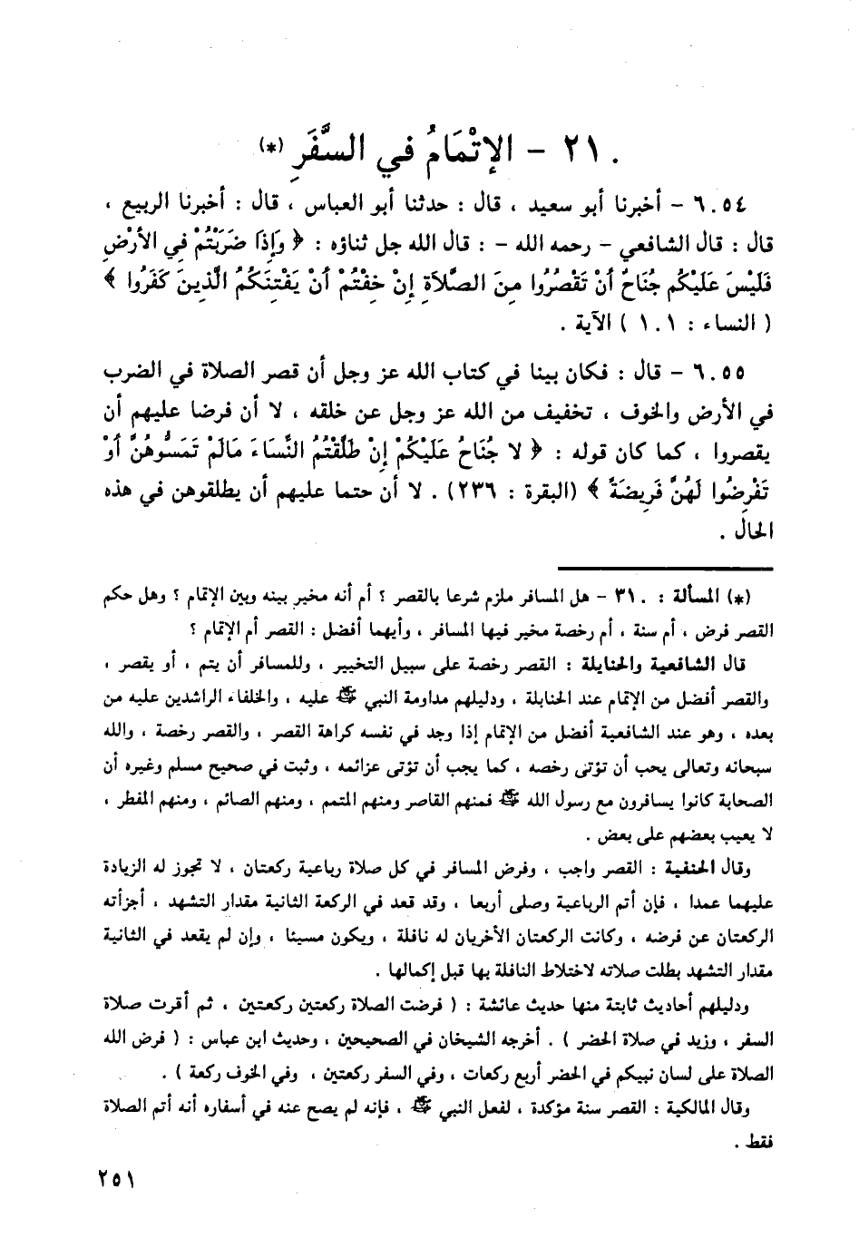 6055 - َ قَالَ: فَكَانَ بَيِّنًا فِي كِتَابِ اللَّهِ عَزَّ وَجَلَّ أَنَّ قَصْرَ الصَّلَاةِ فِي الضَّرْبِ فِي الْأَرْضِ وَالْخَوْفِ، تَخْفِيفٌ مِنَ اللَّهِ عَزَّ وَجَلَّ عَنْ خَلْقِهِ، لَا أَنَّ فَرْضًا عَلَيْهِمْ أَنْ يَقْصُرُوا، كَمَا كَانَ قَوْلُهُ: {لَا جُنَاحَ عَلَيْكُمْ إِنْ طَلَّقْتُمُ النِّسَاءَ مَا لَمْ تَمَسُّوهُنَّ أَوْ تَفْرِضُوا لَهُنَّ فَرِيضَةً} [البقرة: 236] لَا أَنَّ حَتْمًا عَلَيْهِمْ أَنْ يُطَلِّقُوهُنَّ فِي هَذِهِ الْحَالِ -[252]-،
