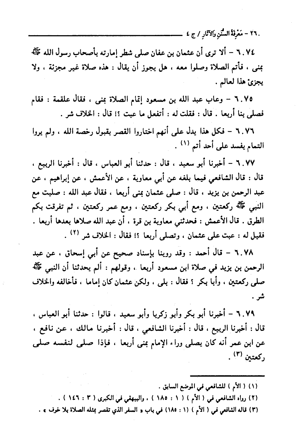 6077 - أَخْبَرَنَا أَبُو سَعِيدٍ قَالَ: حَدَّثَنَا أَبُو الْعَبَّاسِ قَالَ: أَخْبَرَنَا الرَّبِيعُ قَالَ: قَالَ الشَّافِعِيُّ فِيمَا بَلَغَهُ عَنْ أَبِي مُعَاوِيَةَ، عَنِ الْأَعْمَشِ، عَنْ إِبْرَاهِيمَ، عَنْ عَبْدِ الرَّحْمَنِ بْنِ يَزِيدَ قَالَ: صَلَّى عُثْمَانُ بِمِنًى أَرْبَعًا. فَقَالَ عَبْدُ اللَّهِ: «§صَلَّيْتُ مَعَ النَّبِيِّ صَلَّى اللهُ عَلَيْهِ وَسَلَّمَ رَكْعَتَيْنِ، وَمَعَ أَبِي بَكْرٍ رَكْعَتَيْنِ، وَمَعَ عُمَرَ رَكْعَتَيْنِ، ثُمَّ تَفَرَّقَتْ بِكُمُ الطُّرُقُ» قَالَ الْأَعْمَشُ: فَحَدَّثَنِي مُعَاوِيَةُ بْنُ قُرَّةَ، أَنَّ عَبْدَ اللَّهِ صَلَّاهَا بَعْدَهَا أَرْبَعًا. فَقِيلَ لَهُ: عِبْتَ عَلَى عُثْمَانَ وَتُصَلِّي أَرْبَعًا؟ فَقَالَ: الْخِلَافُ شَرٌّ