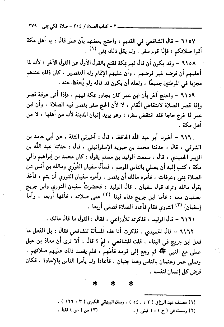 6160 - أَخْبَرَنَا أَبُو عَبْدِ اللَّهِ الْحَافِظُ قَالَ: أَخْبَرَنِي الثِّقَةُ، عَنْ أَبِي حَامِدِ بْنِ الشَّرْقِيِّ قَالَ: حَدَّثَنَا مُحَمَّدُ بْنُ حَيَّوَيْهِ الْإِسْفَرَايِينِيُّ قَالَ: حَدَّثَنَا عَبْدُ اللَّهِ بْنُ الزُّبَيْرِ الْحُمَيْدِيُّ قَالَ: سَمِعْتُ الْوَلِيدَ بْنَ مُسْلِمٍ يَقُولُ: كَانَ مُحَمَّدُ بْنُ إِبْرَاهِيمَ وَالِي مَكَّةَ كَتَبَ إِلَيْهِ أَنْ يُصَلِّيَ بِالنَّاسِ الْمَوْسِمَ، فَسَأَلَ سُفْيَانَ الثَّوْرِيَّ، وَمَالِكَ بْنَ أَنَسٍ عَنِ «§الصَّلَاةِ بِمِنًى، وَعَرَفَاتٍ، فَأَمَرَهُ مَالِكٌ أَنْ يَقْصُرَ، وَأَمَرَهُ سُفْيَانُ الثَّوْرِيُّ أَنْ يُتِمَّ» فَأَخَذَ بِقَوْلِ مَالِكٍ وَتَرَكَ قَوْلَ سُفْيَانَ. قَالَ الْوَلِيدُ: فَحَضَرْتُ سُفْيَانَ الثَّوْرِيَّ، وَابْنَ جُرَيْجٍ يُصَلِّيَانِ مَعَهُ، فَأَمَّا ابْنُ جُرَيْجٍ فَقَامَ فَبَنَا عَلَى صَلَاتِهِ فَأَتَمَّهَا أَرْبَعًا، وَأَمَّا سُفْيَانُ الثَّوْرِيُّ فَقَامَ فَأَعَادَ الصَّلَاةَ فَصَلَّى أَرْبَعًا