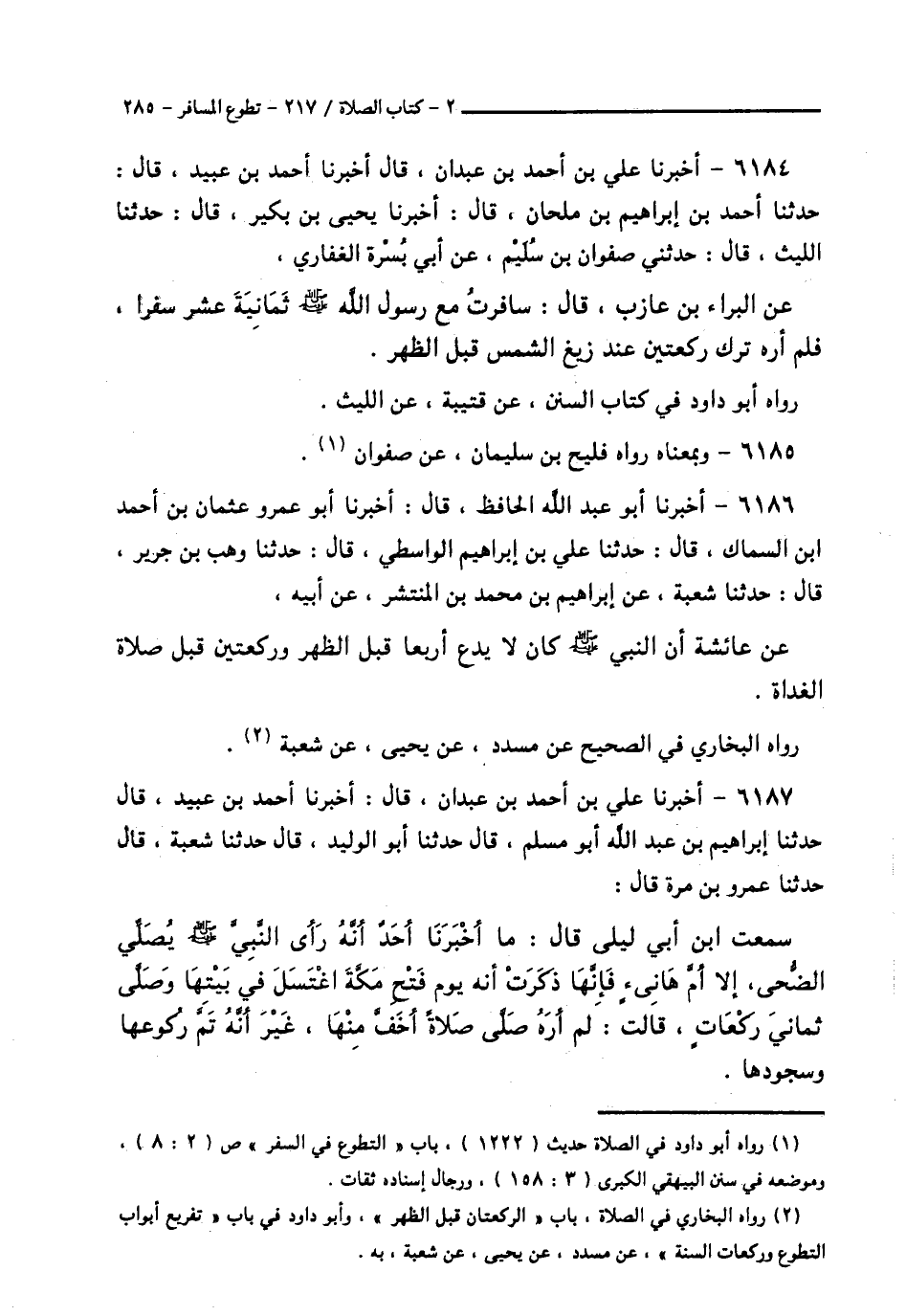 6184 - أَخْبَرَنَا عَلِيُّ بْنُ أَحْمَدَ بْنِ عَبْدَانَ قَالَ أَخْبَرَنَا أَحْمَدُ بْنُ عُبَيْدٍ قَالَ: حَدَّثَنَا أَحْمَدُ بْنُ إِبْرَاهِيمَ بْنِ مِلْحَانَ قَالَ: أَخْبَرَنَا يَحْيَى بْنُ بُكَيْرٍ قَالَ: حَدَّثَنَا اللَّيْثُ قَالَ: حَدَّثَنِي صَفْوَانُ بْنُ سُلَيْمٍ، عَنْ أَبِي بُسْرَةَ الْغِفَارِيِّ، عَنِ الْبَرَاءِ بْنِ عَازِبٍ قَالَ: § «سَافَرْتُ مَعَ رَسُولِ اللَّهِ صَلَّى اللهُ عَلَيْهِ وَسَلَّمَ ثَمَانِيَةَ عَشْرًا سَفَرًا، فَلَمْ أَرَهُ تَرَكَ رَكْعَتَيْنِ عِنْدَ زَيْغِ الشَّمْسِ قَبْلَ الظُّهْرِ» رَوَاهُ أَبُو دَاوُدَ فِي كِتَابِ السُّنَنِ، عَنْ قُتَيْبَةَ، عَنِ اللَّيْثِ،