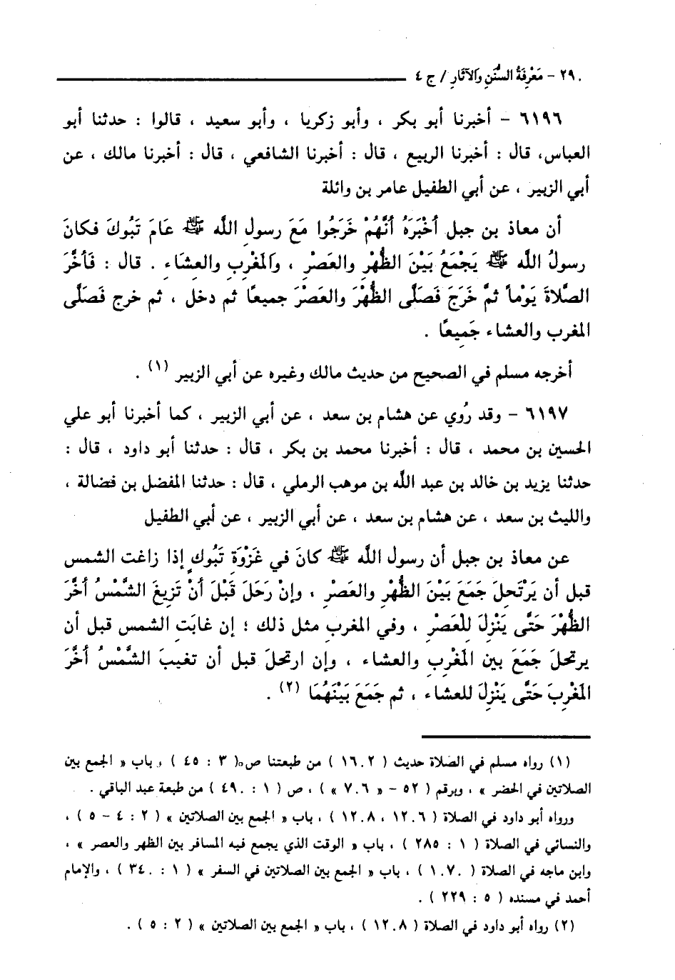 6197 - وَقَدْ رُوِيَ عَنْ هِشَامِ بْنِ سَعْدٍ، عَنْ أَبِي الزُّبَيْرِ كَمَا أَخْبَرَنَا أَبُو عَلِيٍّ الْحُسَيْنُ بْنُ مُحَمَّدٍ قَالَ: أَخْبَرَنَا مُحَمَّدُ بْنُ بَكْرٍ قَالَ: حَدَّثَنَا أَبُو دَاوُدَ قَالَ: حَدَّثَنَا يَزِيدُ بْنُ خَالِدِ بْنِ عَبْدِ اللَّهِ بْنِ مَوْهَبِ الرَّمْلِيُّ قَالَ: حَدَّثَنَا الْمُفَضَّلُ بْنُ فَضَالَةَ، وَاللَّيْثُ بْنُ سَعْدٍ، عَنْ هِشَامِ بْنِ سَعْدٍ، عَنْ أَبِي الزُّبَيْرِ، عَنْ أَبِي الطُّفَيْلِ، عَنْ مُعَاذِ بْنِ جَبَلٍ، أَنَّ رَسُولَ اللَّهِ صَلَّى اللهُ عَلَيْهِ وَسَلَّمَ § «كَانَ فِي غَزْوَةِ تَبُوكَ إِذَا زَاغَتِ الشَّمْسُ قَبْلَ أَنْ يَرْتَحِلَ جَمَعَ بَيْنَ الظُّهْرِ وَالْعَصْرِ، وَإِنِ ارْتَحَلَ قَبْلَ أَنْ تَزَيِغَ الشَّمْسُ أَخَّرَ الظُّهْرَ حَتَّى يَنْزِلَ لِلْعَصْرِ، وَفِي الْمَغْرِبِ مِثْلُ ذَلِكَ، إِنْ غَابَتِ الشَّمْسُ قَبْلَ أَنْ يَرْتَحِلَ جَمَعَ بَيْنَ الْمَغْرِبِ وَالْعِشَاءِ، وَإِنِ ارْتَحَلَ قَبْلَ أَنْ تَغِيبَ الشَّمْسُ أَخَّرَ الْمَغْرِبَ حَتَّى يَنْزِلَ لِلْعِشَاءٍ، ثُمَّ جَمَعَ بَيْنَهُمَا» -[291]-