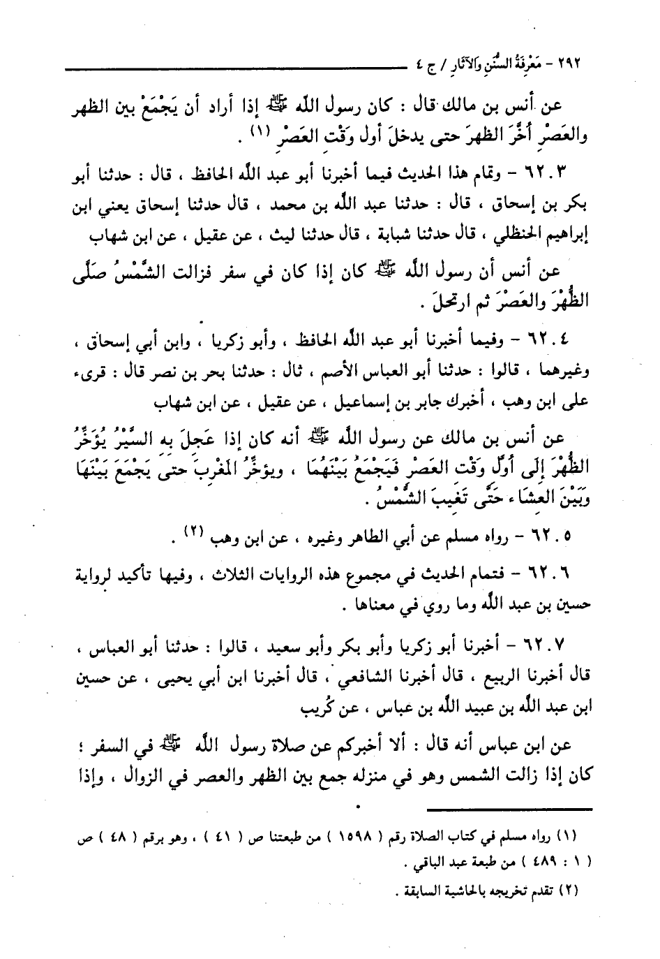 6204 - وَفِيمَا أَخْبَرَنَا أَبُو عَبْدِ اللَّهِ الْحَافِظُ، وَأَبُو زَكَرِيَّا، وَابْنُ أَبِي إِسْحَاقَ، وَغَيْرُهُمَا قَالُوا: حَدَّثَنَا أَبُو الْعَبَّاسِ الْأَصَمُّ قَالَ: حَدَّثَنَا بَحْرُ بْنُ نَصْرٍ قَالَ: قُرِئَ عَلَى ابْنِ وَهْبٍ، أَخْبَرَكَ جَابِرُ بْنُ إِسْمَاعِيلَ، عَنْ عُقَيْلٍ، عَنِ ابْنِ شِهَابٍ، عَنْ أَنَسِ بْنِ مَالِكٍ، عَنْ رَسُولِ اللَّهِ صَلَّى اللهُ عَلَيْهِ وَسَلَّمَ أَنَّهُ كَانَ § «إِذَا عَجَّلَ بِهِ السَّيْرُ يُؤَخِّرُ الظُّهْرَ إِلَى أَوَّلِ وَقْتِ الْعَصْرِ فَيَجْمَعُ بَيْنَهُمَا، وَيُؤَخِّرُ الْمَغْرِبَ حَتَّى يَجْمَعَ بَيْنَهَا وَبَيْنَ الْعِشَاءِ حَتَّى تَغِيبَ الشَّمْسُ»