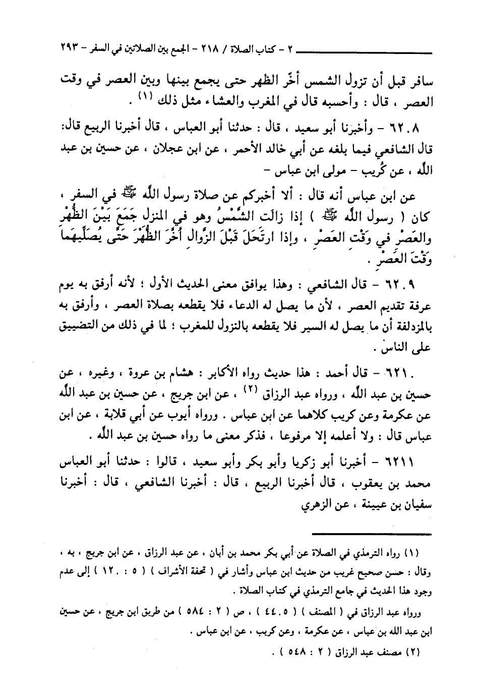 6208 - وَأَخْبَرَنَا أَبُو سَعِيدٍ قَالَ: حَدَّثَنَا أَبُو الْعَبَّاسِ قَالَ أَخْبَرَنَا الرَّبِيعُ قَالَ: قَالَ الشَّافِعِيُّ فِيمَا بَلَغَهُ عَنْ أَبِي خَالِدٍ الْأَحْمَرِ، عَنِ ابْنِ عَجْلَانَ، عَنِ حُسَيْنِ بْنِ عَبْدِ اللَّهِ، عَنْ كُرَيْبٍ مَوْلَى ابْنِ عَبَّاسٍ، عَنِ ابْنِ عَبَّاسٍ أَنَّهُ قَالَ: § «أَلَا أُخْبِرُكُمْ عَنْ صَلَاةِ رَسُولِ اللَّهِ صَلَّى اللهُ عَلَيْهِ وَسَلَّمَ فِي السَّفَرِ، كَانَ رَسُولُ اللَّهِ صَلَّى اللهُ عَلَيْهِ وَسَلَّمَ إِذَا زَالَتِ الشَّمْسُ وَهُوَ فِي الْمَنْزِلِ جَمَعَ بَيْنَ الظُّهْرِ وَالْعَصْرِ فِي وَقْتِ الْعَصْرِ، وَإِذَا ارْتَحَلَ قَبْلَ الزَّوَالِ أَخَّرَ الظُّهْرَ حَتَّى يُصَلِّيَهُمَا وَقْتَ الْعَصْرِ»