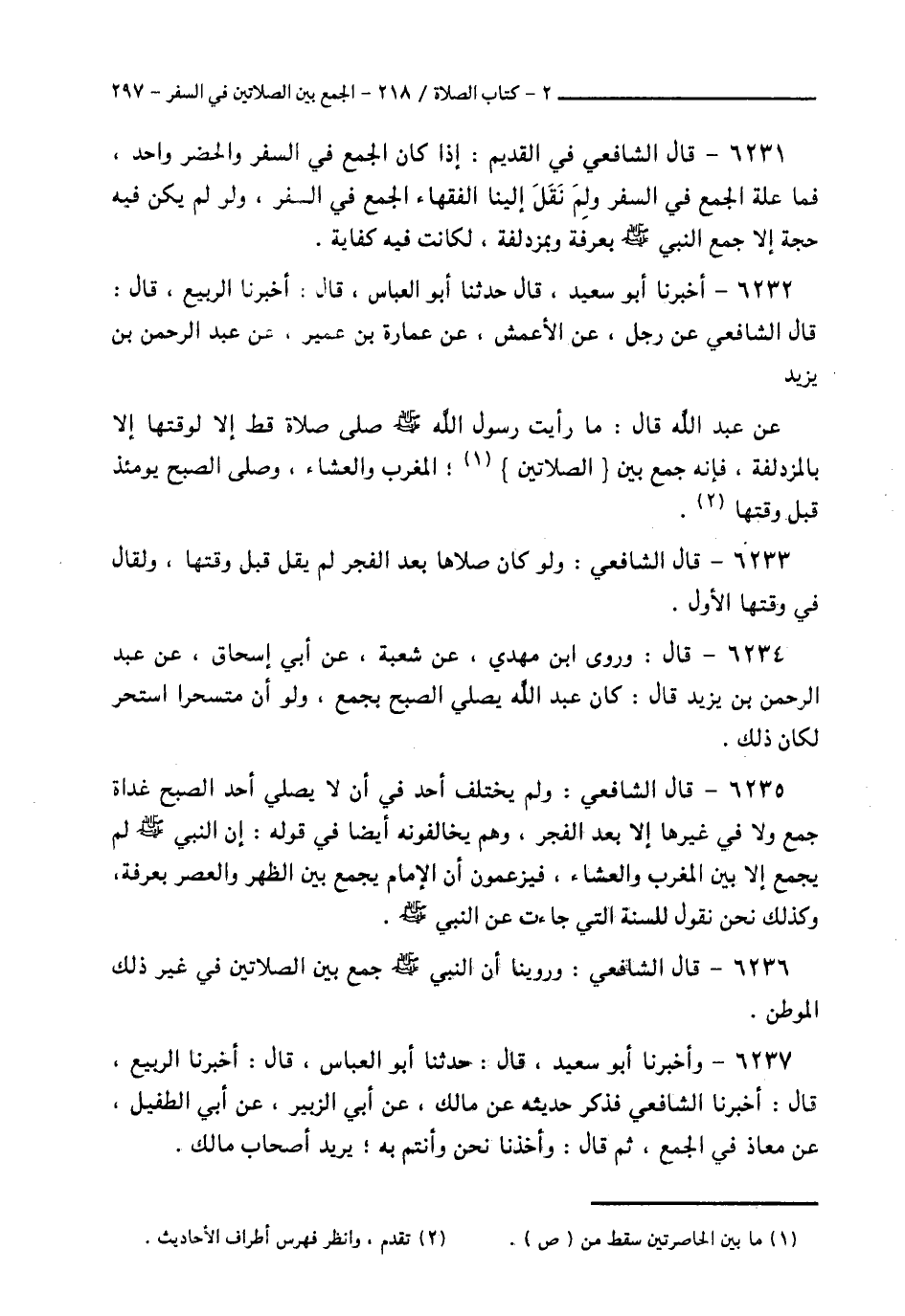 6235 - قَالَ الشَّافِعِيُّ: وَلَوْ يَخْتَلِفُ أَحَدٌ فِي أَنْ لَا يُصَلِّيَ أَحَدٌ الصُّبْحَ غَدَاةً جَمَعَ وَلَا فِي غَيْرِهَا إِلَّا بَعْدَ الْفَجْرِ، وَهُمْ يُخَالِفُونَهُ أَيْضًا فِي قَوْلِهِ: إِنَّ النَّبِيَّ صَلَّى اللهُ عَلَيْهِ وَسَلَّمَ لَمْ يَجْمَعْ إِلَّا بَيْنَ الْمَغْرِبِ وَالْعِشَاءِ، فَيَزْعُمُونَ أَنَّ الْإِمَامَ يَجْمَعُ بَيْنَ الظُّهْرِ وَالْعَصْرِ بِعَرَفَةَ، وَكَذَلِكَ نَحْنُ نَقُولُ لِلسُّنَّةِ الَّتِي جَاءَتْ عَنِ النَّبِيِّ صَلَّى اللهُ عَلَيْهِ وَسَلَّمَ