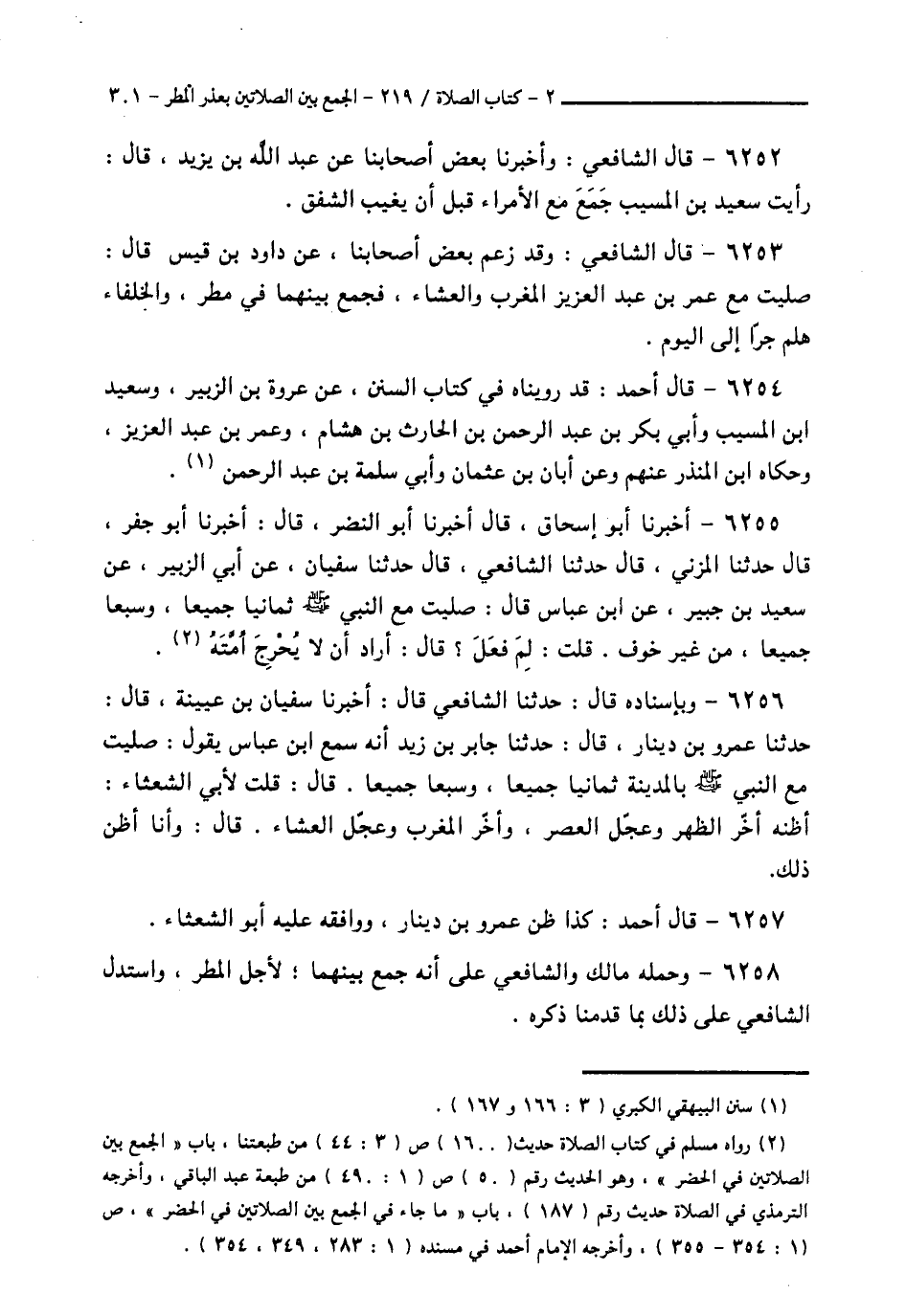 6262 - قَالَ أَحْمَدُ: وَقَدْ أَبَاحَ الشَّافِعِيُّ رَحِمَهُ اللَّهُ الْجَمْعَ بَيْنَ الصَّلَاتَيْنِ بِعُذْرِ الْمَطَرِ فِي وَقْتِ الْأُولَى مِنْهُمَا دُونَ الْأُخْرَى، وَكَانَ فِي الْقَدِيمِ وَالْإِمْلَاءِ يُبِيحُهُ فِي وَقْتِ إِحْدَاهُمَا، كَيْفَ كَانَ أَخَفَّ عَلَيْهِمْ قِيَاسًا عَلَى السَّفَرِ، وَأَبَاحَ فِي السَّفَرِ الْجَمْعَ بَيْنَهُمَا فِي وَقْتِ إِحْدَاهُمَا، وَاسْتَحَبَّ أَنْ يَفْعَلَ فِي كُلِّ وَاحِدَةٍ مِنْهُمَا مَا فَعَلَ النَّبِيُّ صَلَّى اللهُ عَلَيْهِ وَسَلَّمَ