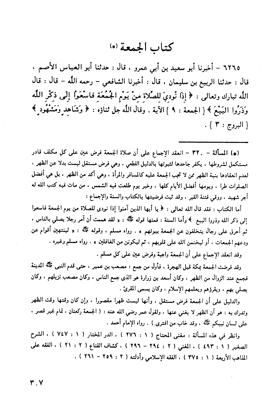 6265 - أَخْبَرَنَا أَبُو سَعِيدِ بْنُ أَبِي عَمْرٍو قَالَ: حَدَّثَنَا أَبُو الْعَبَّاسِ الْأَصَمُّ قَالَ: حَدَّثَنَا الرَّبِيعُ بْنُ سُلَيْمَانَ قَالَ: أَخْبَرَنَا الشَّافِعِيُّ رَحِمَهُ اللَّهُ قَالَ: قَالَ اللَّهُ تَبَارَكَ وَتَعَالَى: " {§إِذَا نُودِيَ لِلصَّلَاةِ مِنْ يَوْمِ الْجُمُعَةِ فَاسْعَوْا إِلَى ذِكْرِ اللَّهِ وَذَرُوا الْبَيْعَ} [الجمعة: 9] الْآيَةَ. وَقَالَ اللَّهُ جَلَّ ثَنَاؤُهُ: {وَشَاهِدٍ وَمَشْهُودٍ} [البروج: 3] "