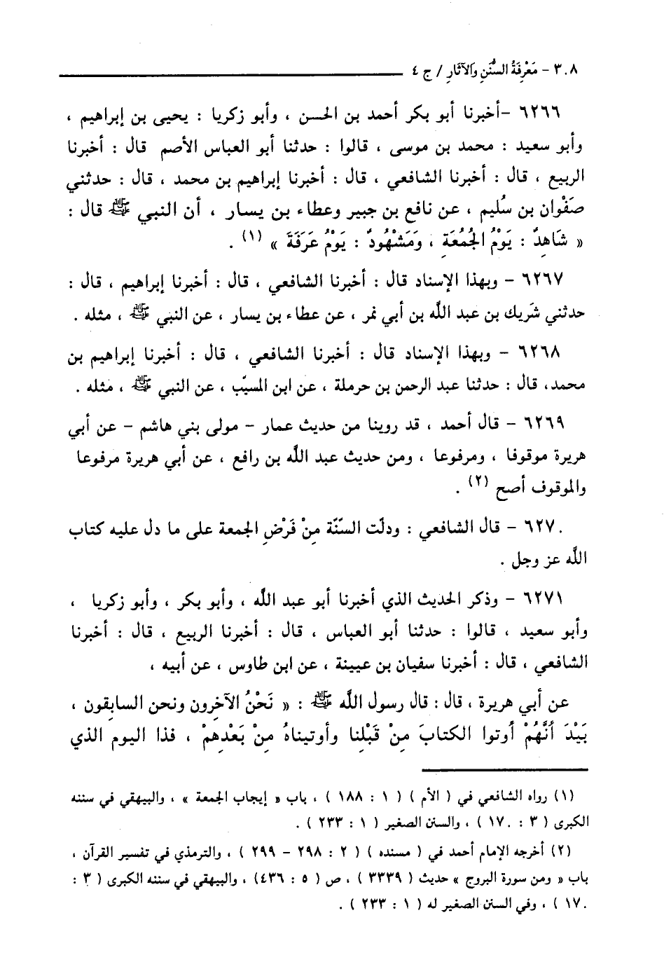 6266 - أَخْبَرَنَا أَبُو بَكْرٍ أَحْمَدُ بْنُ الْحَسَنِ، وَأَبُو زَكَرِيَّا يَحْيَى بْنُ إِبْرَاهِيمَ، وَأَبُو سَعِيدٍ مُحَمَّدُ بْنُ مُوسَى قَالُوا: حَدَّثَنَا أَبُو الْعَبَّاسِ الْأَصَمُّ قَالَ: أَخْبَرَنَا الرَّبِيعُ قَالَ: أَخْبَرَنَا الشَّافِعِيُّ قَالَ: أَخْبَرَنَا إِبْرَاهِيمُ بْنُ مُحَمَّدٍ قَالَ: حَدَّثَنِي صَفْوَانُ بْنُ سُلَيْمٍ، عَنْ نَافِعِ بْنِ جُبَيْرٍ، وَعَطَاءِ بْنِ يَسَارٍ، أَنَّ النَّبِيَّ صَلَّى اللهُ عَلَيْهِ وَسَلَّمَ قَالَ: " §شَاهِدٌ: يَوْمُ الْجُمُعَةِ، وَمَشْهُودٍ: يَوْمُ عَرَفَةَ "