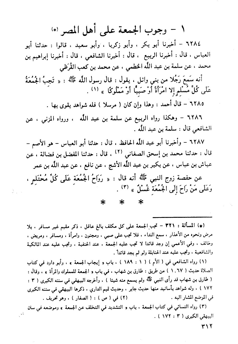 6284 - أَخْبَرَنَا أَبُو بَكْرٍ، وَأَبُو زَكَرِيَّا، وَأَبُو سَعِيدٍ قَالُوا: حَدَّثَنَا أَبُو الْعَبَّاسِ قَالَ: أَخْبَرَنَا الرَّبِيعُ قَالَ: أَخْبَرَنَا الشَّافِعِيُّ قَالَ: أَخْبَرَنَا إِبْرَاهِيمُ بْنُ مُحَمَّدٍ، عَنْ سَلَمَةَ بْنِ عَبْدِ اللَّهِ الْخَطْمِيِّ، عَنْ مُحَمَّدِ بْنِ كَعْبٍ الْقُرَظِيِّ، أَنَّهُ سَمِعَ رَجُلًا مِنْ بَنِي وَائِلٍ يَقُولُ: قَالَ رَسُولُ اللَّهِ صَلَّى اللهُ عَلَيْهِ وَسَلَّمَ: § «تَجِبُ الْجُمُعَةُ عَلَى كُلِّ مُسْلِمٍ إِلَّا امْرَأَةً أَوْ صَبِيًّا أَوْ مَمْلُوكًا»