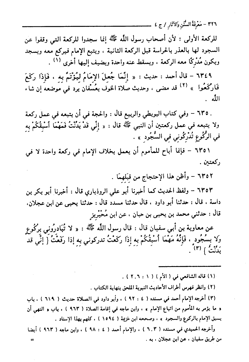6353 - وَلَفْظُ الْحَدِيثِ كَمَا أَخْبَرَنَا أَبُو عَلِيٍّ الرُّوذْبَارِيُّ قَالَ: أَخْبَرَنَا أَبُو بَكْرِ بْنُ دَاسَةَ قَالَ: حَدَّثَنَا أَبُو دَاوُدَ قَالَ حَدَّثَنَا مُسَدَّدٌ قَالَ: حَدَّثَنَا يَحْيَى، عَنِ ابْنِ عَجْلَانَ قَالَ: حَدَّثَنِي مُحَمَّدُ بْنُ يَحْيَى بْنِ حَبَّانَ، عَنِ ابْنِ مُحَيْرِيزٍ، عَنْ مُعَاوِيَةَ بْنِ أَبِي سُفْيَانَ قَالَ: قَالَ رَسُولُ اللَّهِ صَلَّى اللهُ عَلَيْهِ وَسَلَّمَ: «§لَا تُبَادِرُونِي بِرُكُوعٍ وَلَا بِسُجُودٍ، فَإِنَّهُ مَهْمَا أَسْبِقْكُمْ بِهِ إِذَا رَكَعْتُ تُدْرِكُونِي بِهِ إِذَا رَفَعْتُ؛ إِنِّي قَدْ بَدَّنْتُ» -[327]-