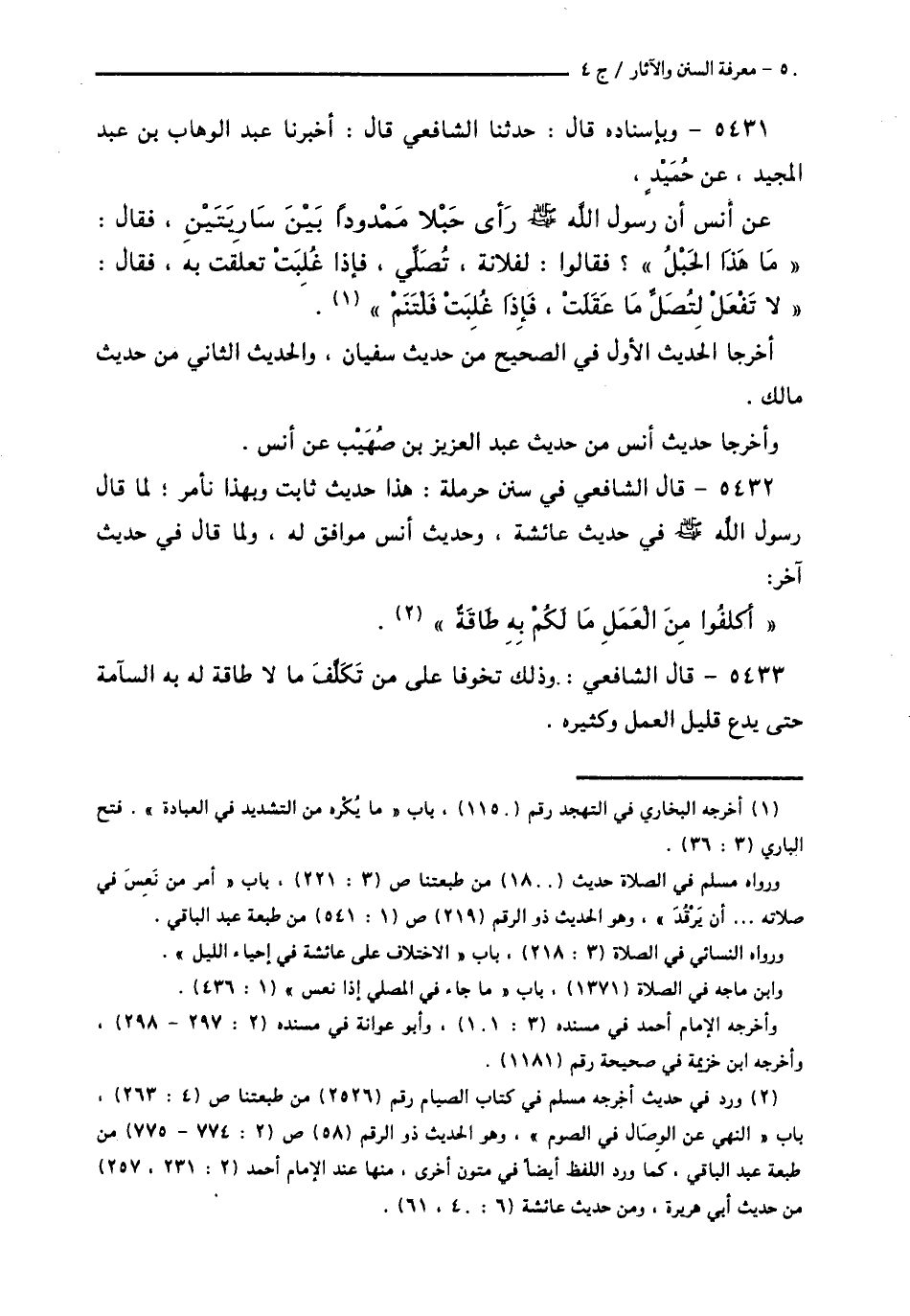 5432 - قَالَ الشَّافِعِيُّ فِي سُنَنِ حَرْمَلَةَ: هَذَا حَدِيثٌ ثَابِتٌ، وَبِهَذَا نَأْمُرُ لِمَا قَالَ رَسُولُ اللَّهِ صَلَّى اللهُ عَلَيْهِ وَسَلَّمَ فِي حَدِيثِ عَائِشَةَ، وَحَدِيثُ أَنَسٍ مُوَافِقٌ لَهُ، وَلِمَا قَالَ فِي حَدِيثٍ آخَرَ: «أَكْلِفُوا مِنَ الْعَمَلِ مَا لَكُمْ بِهِ طَاقَةٌ»