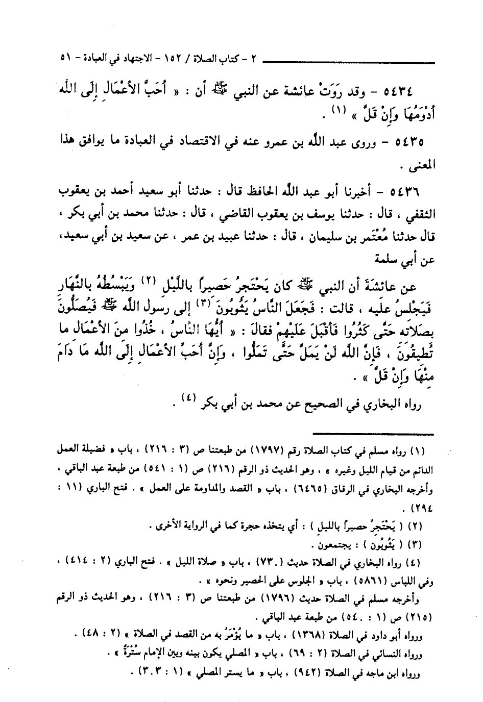 5436 - أَخْبَرَنَا أَبُو عَبْدِ اللَّهِ الْحَافِظُ قَالَ: حَدَّثَنَا أَبُو سَعِيدٍ أَحْمَدُ بْنُ يَعْقُوبَ الثَّقَفِيُّ قَالَ: حَدَّثَنَا يُوسُفُ بْنُ يَعْقُوبَ الْقَاضِي قَالَ: حَدَّثَنَا مُحَمَّدُ بْنُ أَبِي بَكْرٍ قَالَ حَدَّثَنَا مُعْتَمِرُ بْنُ سُلَيْمَانَ قَالَ: حَدَّثَنَا عُبَيْدُ بْنُ عُمَرَ، عَنْ سَعِيدِ بْنِ أَبِي سَعِيدٍ، عَنْ أَبِي سَلَمَةَ، عَنْ عَائِشَةَ، أَنَّ النَّبِيَّ صَلَّى اللهُ عَلَيْهِ وَسَلَّمَ كَانَ يَحْتَجِرُ حَصِيرًا بِاللَّيْلِ وَيَبْسُطُهُ بِالنَّهَارِ، فَيَجْلِسُ عَلَيْهِ قَالَتْ: فَجَعَلَ النَّاسُ يَثُوبُونَ إِلَى رَسُولِ اللَّهِ صَلَّى اللهُ عَلَيْهِ وَسَلَّمَ فَيُصَلُّونَ بِصَلَاتِهِ حَتَّى كَثُرُوا فَأَقْبَلَ عَلَيْهِمْ فَقَالَ: § «أَيُّهَا النَّاسُ خُذُوا مِنَ الْأَعْمَالِ مَا تُطِيقُونَ؛ فَإِنَّ اللَّهَ لَنْ يَمَلَّ حَتَّى تَمَلُّوا، وَإِنَّ أَحَبَّ الْأَعْمَالِ إِلَى اللَّهِ مَا دَامَ مِنْهَا وَإِنْ قَلَّ» رَوَاهُ الْبُخَارِيُّ فِي الصَّحِيحِ عَنْ مُحَمَّدِ بْنِ أَبِي بَكْرٍ