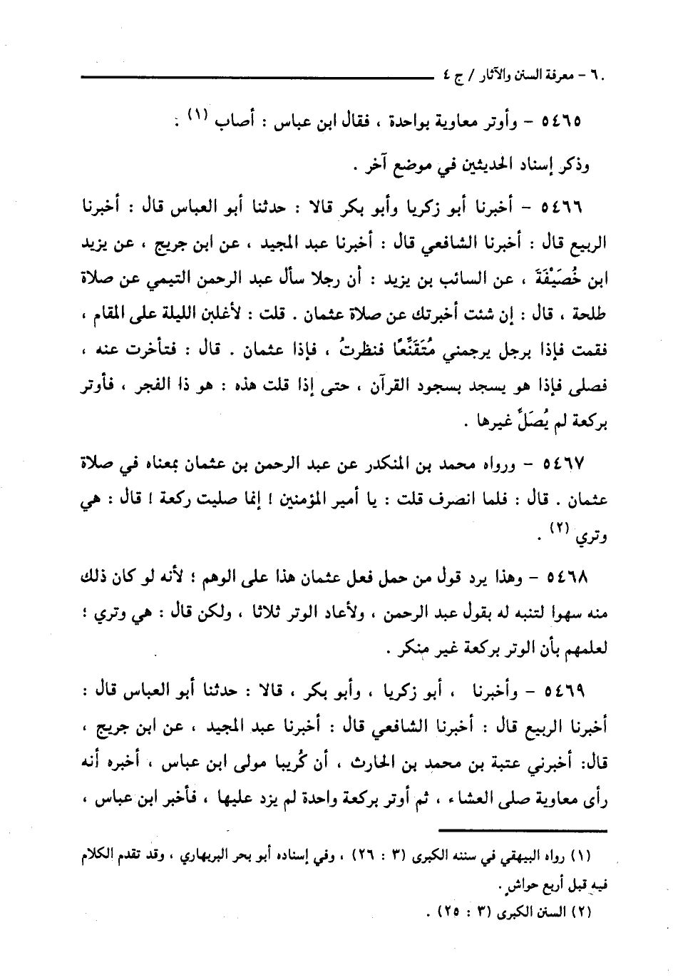 5466 - أَخْبَرَنَا أَبُو زَكَرِيَّا، وَأَبُو بَكْرٍ قَالَا: حَدَّثَنَا أَبُو الْعَبَّاسِ قَالَ: أَخْبَرَنَا الرَّبِيعُ قَالَ: أَخْبَرَنَا الشَّافِعِيُّ قَالَ: أَخْبَرَنَا عَبْدُ الْمَجِيدِ، عَنِ ابْنِ جُرَيْجٍ، عَنْ يَزِيدَ بْنِ خُصَيْفَةَ، عَنِ السَّائِبِ بْنِ يَزِيدَ، أَنَّ رَجُلًا سَأَلَ عَبْدَ الرَّحْمَنِ التَّيْمِيَّ عَنْ صَلَاةِ طَلْحَةَ؟ قَالَ: إِنْ شِئْتَ أَخْبَرْتُكَ عَنْ صَلَاةِ عُثْمَانَ. قُلْتُ: لَأُغْلَبَنَّ اللَّيْلَةَ عَلَى الْمُقَامِ فَقُمْتُ، فَإِذَا بِرَجُلٍ يَرْجُمُنِي مُتَقَنِّعًا فَنَظَرْتُ، فَإِذَا عُثْمَانُ. قَالَ: فَتَأَخَّرْتُ عَنْهُ، فَصَلَّى، فَإِذَا هُوَ يَسْجُدُ بِسُجُودِ الْقُرْآنِ، حَتَّى إِذَا قُلْتُ هَذِهِ: هُوَ ذَا الْفَجْرِ، § «فَأَوْتَرَ بِرَكْعَةٍ لَمْ يُصَلِّ غَيْرَهَا»
