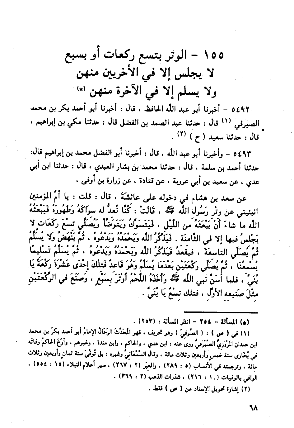 5493 - وَأَخْبَرَنَا أَبُو عَبْدِ اللَّهِ قَالَ: أَخْبَرَنَا أَبُو الْفَضْلِ مُحَمَّدُ بْنُ إِبْرَاهِيمَ قَالَ: حَدَّثَنَا أَحْمَدُ بْنُ سَلَمَةَ قَالَ: حَدَّثَنَا مُحَمَّدُ بْنُ بَشَّارٍ الْعَبْدِيُّ قَالَ: حَدَّثَنَا ابْنُ أَبِي عَدِيٍّ، عَنْ سَعِيدِ بْنِ أَبِي عَرُوبَةَ، عَنْ قَتَادَةَ، عَنْ زُرَارَةَ بْنِ أَوْفَى، عَنْ سَعْدِ بْنِ هِشَامٍ فِي دُخُولِهِ عَلَى عَائِشَةَ قَالَ: قُلْتُ: §" يَا أُمَّ الْمُؤْمِنِينَ أَنْبِئِينِي عَنْ وِتْرِ رَسُولِ اللَّهِ صَلَّى اللهُ عَلَيْهِ وَسَلَّمَ قَالَتْ: كُنَّا نُعِدُّ لَهُ سِوَاكَهُ وَطَهُورَهُ فَيَبْعَثُهُ اللَّهُ مَا شَاءَ أَنْ يَبْعَثَهُ مِنَ اللَّيْلِ، فَيَتَسَوَّكُ وَيَتَوَضَّأُ وَيُصَلِّي تِسْعَ رَكَعَاتٍ لَا يَجْلِسُ فِيهَا إِلَّا فِي الثَّامِنَةِ. فَيَذْكُرُ اللَّهَ وَيَحْمَدُهُ وَيَدْعُوهُ، ثُمَّ يَنْهَضُ وَلَا يُسَلِّمُ ثُمَّ يُصَلِّي التَّاسِعَةَ، فَيَقْعُدُ فَيَذْكُرُ اللَّهَ وَيَحَمُدُهُ وَيَدْعُوهُ، ثُمَّ يُسَلِّمُ تَسْلِيمًا يُسْمِعُنَا، ثُمَّ يُصَلِّي رَكْعَتَيْنِ بَعْدَمَا يُسَلِّمُ وَهُوَ قَاعِدٌ فَتِلْكَ إِحْدَى عَشْرَةَ رَكْعَةً يَا بُنَيَّ. فَلَمَّا أَسَنَّ نَبِيُّ اللَّهِ صَلَّى اللهُ عَلَيْهِ وَسَلَّمَ وَأَخَذَهُ اللَّحْمُ أَوْتَرَ بِسَبْعٍ، وَصَنَعَ فِي الرَّكْعَتَيْنِ مِثْلَ صَنِيعِهِ الْأَوَّلِ، فَتِلْكَ تِسْعٌ يَا بُنَيَّ «-[69]- رَوَاهُ مُسْلِمٌ فِي الصَّحِيحِ عَنْ مُحَمَّدِ بْنِ الْمُثَنَّى، عَنْ مُحَمَّدِ بْنِ أَبِي عَدِيٍّ.