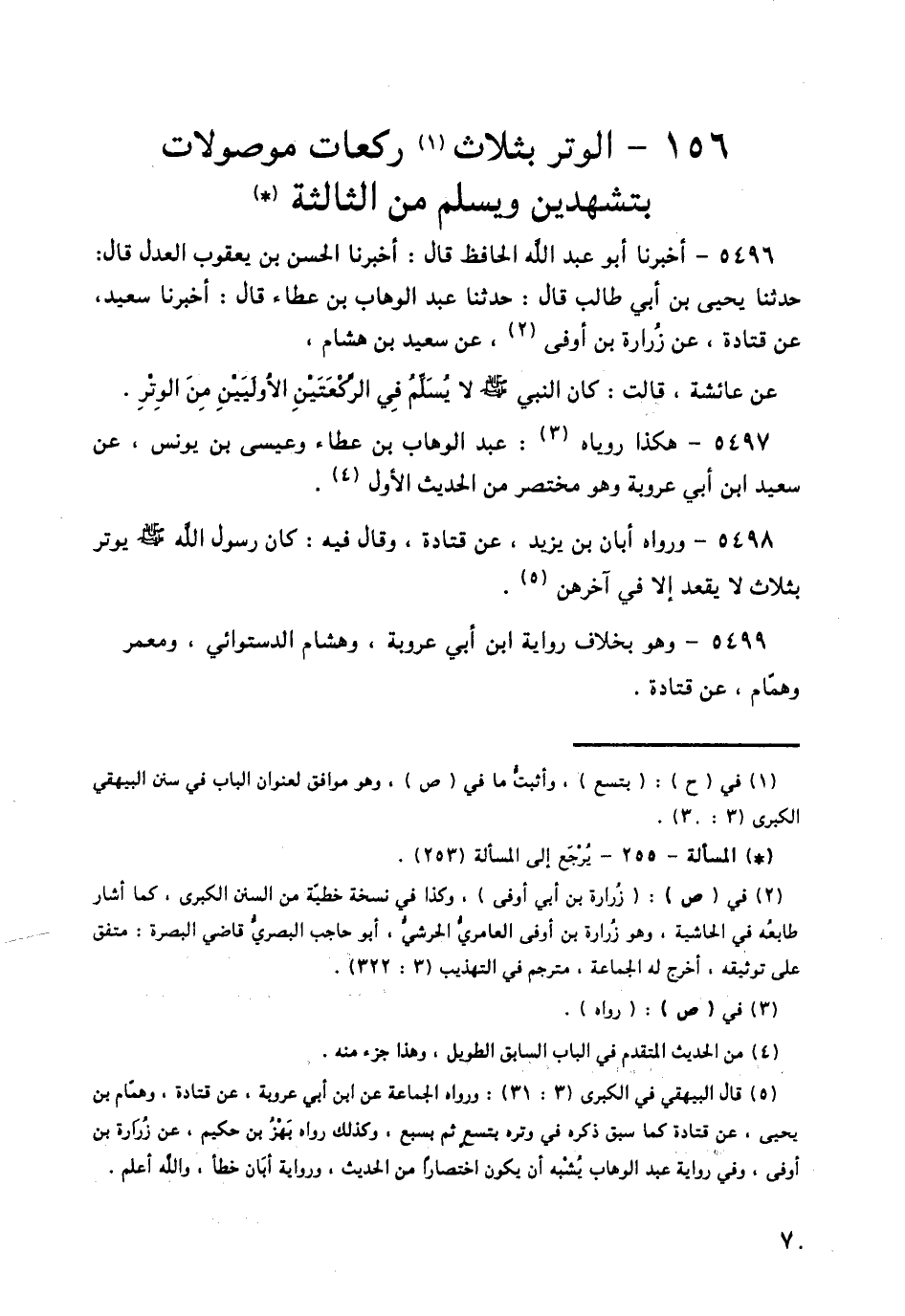 5496 - أَخْبَرَنَا أَبُو عَبْدِ اللَّهِ الْحَافِظُ قَالَ: أَخْبَرَنَا الْحَسَنُ بْنُ يَعْقُوبَ الْعَدْلُ قَالَ: حَدَّثَنَا يَحْيَى بْنُ أَبِي طَالِبٍ قَالَ: حَدَّثَنَا عَبْدُ الْوَهَّابِ بْنُ عَطَاءٍ قَالَ: أَخْبَرَنَا سَعِيدٌ، عَنْ قَتَادَةَ، عَنْ زُرَارَةَ بْنِ أَوْفَى، عَنْ سَعِيدِ بْنِ هِشَامٍ، عَنْ عَائِشَةَ قَالَتْ: كَانَ النَّبِيُّ صَلَّى اللهُ عَلَيْهِ وَسَلَّمَ § «لَا يُسَلِّمُ فِي الرَّكْعَتَيْنِ الْأُولَيَيْنِ مِنَ الْوِتْرِ»