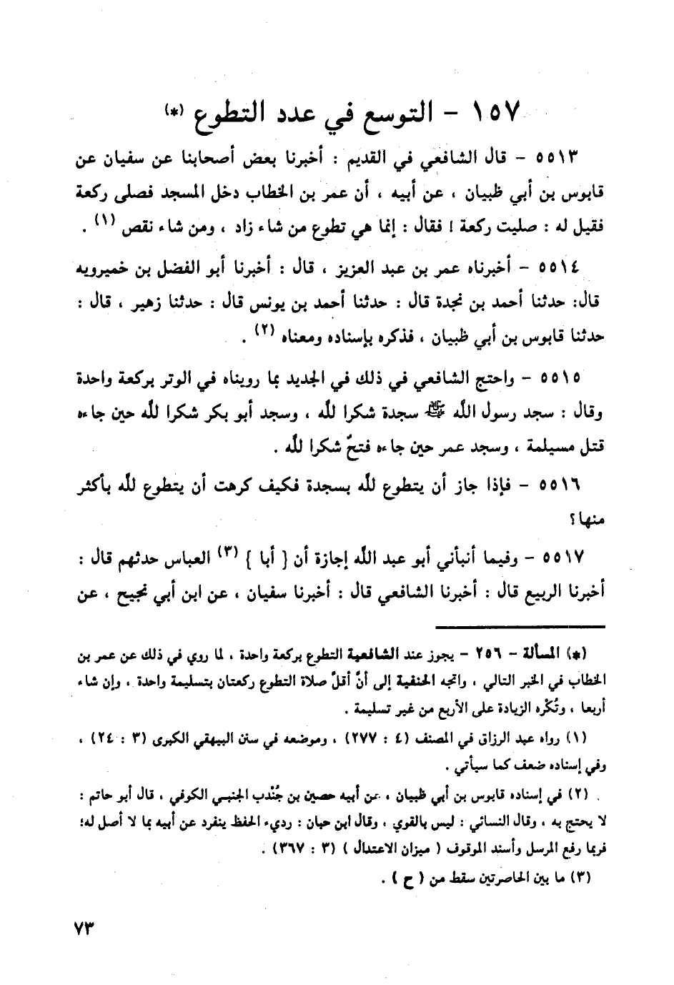 5513 - قَالَ الشَّافِعِيُّ فِي الْقَدِيمِ: أَخْبَرَنَا بَعْضُ أَصْحَابِنَا، عَنْ سُفْيَانَ، عَنْ قَابُوسَ بْنِ أَبِي ظَبْيَانَ، عَنْ أَبِيهِ، أَنَّ عُمَرَ بْنَ الْخَطَّابِ دَخَلَ الْمَسْجِدَ فَصَلَّى رَكْعَةً فَقِيلَ لَهُ: " §صَلَّيْتَ رَكْعَةً فَقَالَ: إِنَّمَا هِيَ تَطَوُّعٌ مَنْ شَاءَ زَادَ، وَمَنْ شَاءَ نَقَصَ "