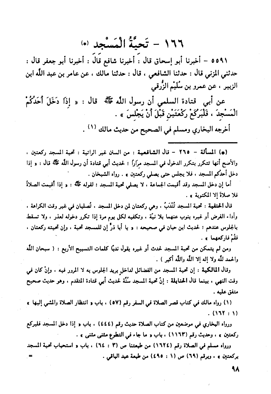 5591 - أَخْبَرَنَا أَبُو إِسْحَاقَ قَالَ: أَخْبَرَنَا شَافِعٌ قَالَ: أَخْبَرَنَا أَبُو جَعْفَرٍ قَالَ: حَدَّثَنِي الْمُزَنِيُّ قَالَ: حَدَّثَنَا الشَّافِعِيُّ قَالَ: حَدَّثَنَا مَالِكٌ، عَنْ عَامِرِ بْنِ عَبْدِ اللَّهِ بْنِ الزُّبَيْرِ، عَنْ عَمْرِو بْنِ سُلَيْمٍ الزُّرَقِيِّ، عَنْ أَبِي قَتَادَةَ السُّلَمِيِّ، أَنَّ رَسُولَ اللَّهِ صَلَّى اللهُ عَلَيْهِ وَسَلَّمَ قَالَ: «§إِذَا دَخَلَ أَحَدُكُمُ الْمَسْجِدَ، فَلْيَرْكَعْ رَكْعَتَيْنِ قَبْلَ أَنْ يَجْلِسَ» أَخْرَجَهُ الْبُخَارِيُّ، وَمُسْلِمٌ فِي الصَّحِيحِ مِنْ حَدِيثِ مَالِكٍ -[99]-