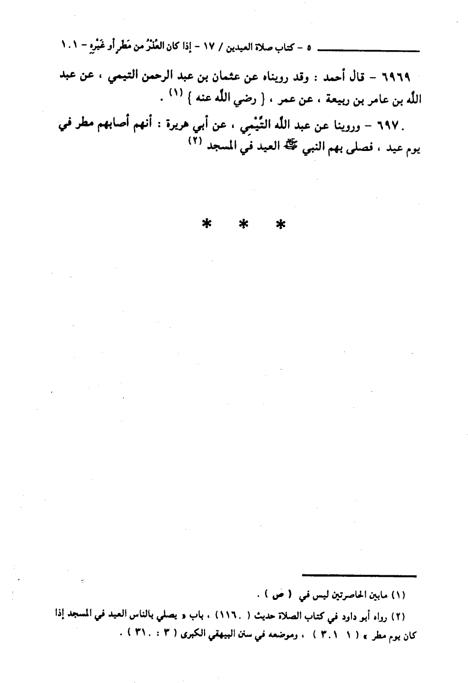 6970 - وَرُوِّينَا عَنْ عَبْدِ اللَّهِ التَّيْمِيِّ، عَنْ أَبِي هُرَيْرَةَ، أَنَّهُمْ «§أَصَابَهُمْ مَطَرٌ فِي يَوْمِ عِيدٍ، فَصَلَّى بِهِمُ النَّبِيُّ صَلَّى اللهُ عَلَيْهِ وَسَلَّمَ الْعِيدَ فِي الْمَسْجِدِ»