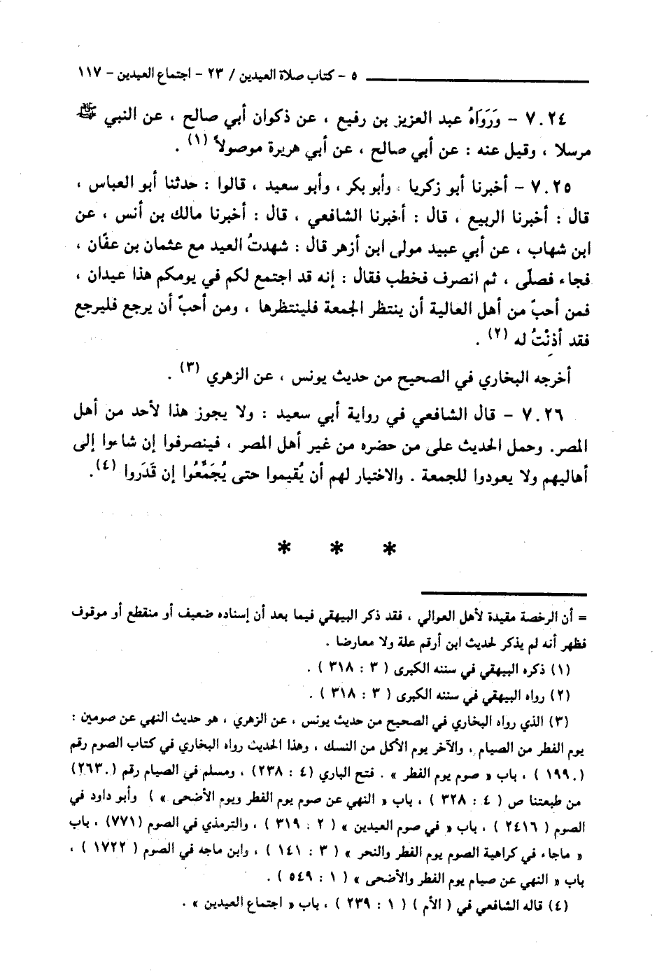 7025 - أَخْبَرَنَا أَبُو زَكَرِيَّا، وَأَبُو بَكْرٍ، وَأَبُو سَعِيدٍ قَالُوا: حَدَّثَنَا أَبُو الْعَبَّاسِ قَالَ: أَخْبَرَنَا الرَّبِيعُ قَالَ: أَخْبَرَنَا الشَّافِعِيُّ قَالَ: أَخْبَرَنَا مَالِكُ بْنُ أَنَسٍ، عَنِ ابْنِ شِهَابٍ، عَنْ أَبِي عُبَيْدٍ مَوْلَى ابْنِ أَزْهَرَ قَالَ: شَهِدْتُ الْعِيدَ مَعَ عُثْمَانَ بْنِ عَفَّانَ، فَجَاءَ فَصَلَّى، ثُمَّ انْصَرَفَ فَخَطَبَ فَقَالَ: «§إِنَّهُ قَدِ اجْتَمَعَ لَكُمْ فِي يَوْمِكُمْ هَذَا عِيدَانِ، فَمَنْ أَحَبَّ مِنْ أَهْلِ الْعَالِيَةِ أَنْ يَنْتَظِرَ الْجُمُعَةَ فَلْيَنْتَظِرْهَا، وَمَنْ أَحَبَّ أَنْ يَرْجِعَ فَلْيَرْجِعْ فَقَدْ أَذِنْتُ لَهُ» أَخْرَجَهُ الْبُخَارِيُّ فِي الصَّحِيحِ مِنْ حَدِيثِ يُونُسَ، عَنِ الزُّهْرِيِّ