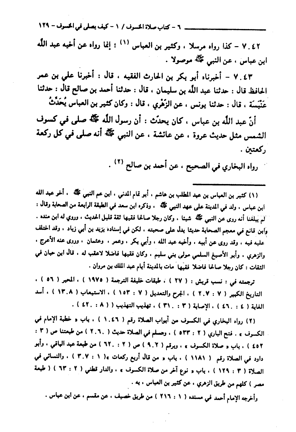 7043 - أَخْبَرَنَاهُ أَبُو بَكْرِ بْنُ الْحَارِثِ الْفَقِيهُ قَالَ: أَخْبَرَنَا عَلِيُّ بْنُ عُمَرَ الْحَافِظُ قَالَ: حَدَّثَنَا عَبْدُ اللَّهِ بْنُ سُلَيْمَانَ قَالَ: حَدَّثَنَا أَحْمَدُ بْنُ صَالِحٍ قَالَ: حَدَّثَنَا عَنْبَسَةُ قَالَ: حَدَّثَنَا يُونُسُ، عَنِ الزُّهْرِيِّ قَالَ: وَكَانَ كَثِيرُ بْنُ الْعَبَّاسِ يُحَدِّثُ أَنَّ عَبْدَ اللَّهِ بْنَ عَبَّاسٍ، كَانَ يُحَدِّثُ: أَنَّ رَسُولَ اللَّهِ صَلَّى اللهُ عَلَيْهِ وَسَلَّمَ «§صَلَّى فِي كُسُوفِ الشَّمْسِ» مِثْلَ حَدِيثِ عُرْوَةَ، عَنْ عَائِشَةَ، عَنِ النَّبِيِّ صَلَّى اللهُ عَلَيْهِ وَسَلَّمَ أَنَّهُ «صَلَّى فِي كُلِّ رَكْعَةٍ رَكْعَتَيْنِ» رَوَاهُ الْبُخَارِيُّ فِي الصَّحِيحِ، عَنْ أَحْمَدَ بْنِ صَالِحٍ