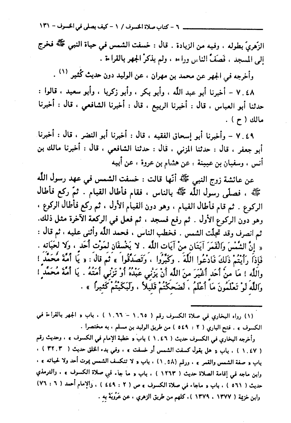 7049 - وَأَخْبَرَنَا أَبُو إِسْحَاقَ الْفَقِيهُ قَالَ: أَخْبَرَنَا أَبُو النَّضْرِ قَالَ: أَخْبَرَنَا أَبُو جَعْفَرٍ قَالَ: حَدَّثَنَا الْمُزَنِيُّ قَالَ: حَدَّثَنَا الشَّافِعِيُّ قَالَ: أَخْبَرَنَا مَالِكُ بْنُ أَنَسٍ، وَسُفْيَانُ بْنُ عُيَيْنَةَ، عَنْ هِشَامِ بْنِ عُرْوَةَ، عَنْ أَبِيهِ، عَنْ عَائِشَةَ زَوْجِ النَّبِيِّ صَلَّى اللهُ عَلَيْهِ وَسَلَّمَ أَنَّهَا قَالَتْ: خَسَفَتِ الشَّمْسُ فِي عَهْدِ رَسُولِ اللَّهِ صَلَّى اللهُ عَلَيْهِ وَسَلَّمَ، فَصَلَّى رَسُولُ اللَّهِ صَلَّى اللهُ عَلَيْهِ وَسَلَّمَ بِالنَّاسِ، فَقَامَ فَأَطَالَ الْقِيَامَ، ثُمَّ رَكَعَ فَأَطَالَ الرُّكُوعَ، ثُمَّ قَامَ فَأَطَالَ الْقِيَامَ، وَهُوَ دُونَ الْقِيَامِ الْأَوَّلِ، ثُمَّ رَكَعَ فَأَطَالَ الرُّكُوعَ، وَهُوَ دُونَ الرُّكُوعِ الْأَوَّلِ ثُمَّ رَفَعَ فَسَجَدَ، ثُمَّ فَعَلَ فِي الرَّكْعَةِ الْآخِرَةِ مِثْلَ ذَلِكَ ثُمَّ انْصَرَفَ وَقَدْ تَجَلَّتِ الشَّمْسُ فَخَطَبَ النَّاسَ، فَحَمِدَ اللَّهَ وَأَثْنَى عَلَيْهِ، ثُمَّ قَالَ: § «إِنَّ الشَّمْسَ وَالْقَمَرَ آيَتَانِ مِنْ آيَاتِ اللَّهِ لَا يَخْسِفَانِ لِمَوْتِ أَحَدٍ، وَلَا لِحَيَاتِهِ فَإِذَا رَأَيْتُمْ ذَلِكَ فَادْعُوا اللَّهَ وَكَبِّرُوا، وَتَصَدَّقُوا» ثُمَّ قَالَ: «يَا أُمَّةَ مُحَمَّدٍ وَاللَّهِ مَا مِنْ أَحَدٍ أَغْيَرَ مِنَ اللَّهِ أَنْ يَزْنِيَ عَبْدُهُ أَوْ تَزْنِيَ أَمَتُهُ يَا أُمَّةَ مُحَمَّدٍ وَاللَّهِ لَوْ تَعْلَمُونَ مَا أَعْلَمُ، لَضَحِكْتُمْ قَلِيلًا، وَلَبَكَيْتُمْ كَثِيرًا» -[132]-