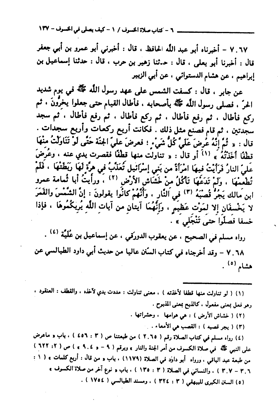 7067 - أَخْبَرَنَاهُ أَبُو عَبْدِ اللَّهِ الْحَافِظُ قَالَ: أَخْبَرَنِي أَبُو عَمْرِو بْنُ أَبِي جَعْفَرٍ قَالَ: أَخْبَرَنَا أَبُو يَعْلَى قَالَ: حَدَّثَنَا زُهَيْرُ بْنُ حَرْبٍ قَالَ: حَدَّثَنَا إِسْمَاعِيلُ بْنُ إِبْرَاهِيمَ، عَنْ هِشَامٍ الدَّسْتُوَائِيِّ، عَنْ أَبِي الزُّبَيْرِ، عَنْ جَابِرٍ قَالَ: كَسَفَتِ الشَّمْسُ عَلَى عَهْدِ رَسُولِ اللَّهِ صَلَّى اللهُ عَلَيْهِ وَسَلَّمَ فِي يَوْمٍ شَدِيدِ الْحَرِّ، فَصَلَّى رَسُولُ اللَّهِ صَلَّى اللهُ عَلَيْهِ وَسَلَّمَ بِأَصْحَابِهِ فَأَطَالَ الْقِيَامَ حَتَّى جَعَلُوا يَخِرُّونَ، ثُمَّ رَكَعَ فَأَطَالَ، ثُمَّ رَفَعَ فَأَطَالَ، ثُمَّ رَكَعَ فَأَطَالَ، ثُمَّ رَفَعَ فَأَطَالَ، ثُمَّ سَجَدَ سَجْدَتَيْنٍ، ثُمَّ قَامَ فَصَنَعَ مِثْلَ ذَلِكَ فَكَانَتْ أَرْبَعَ رَكَعَاتٍ وَأَرْبَعَ سَجَدَاتٍ قَالَ: «ثُمَّ إِنَّهُ» §عُرِضَ عَلَيَّ كُلُّ شَيْءٍ، فَعُرِضَ عَلَيَّ الْجَنَّةُ حَتَّى لَوْ تَنَاوَلْتُ مِنْهَا قِطْفًا أَخَذْتُهُ " أَوْ قَالَ: " تَنَاوَلْتُ مِنْهَا قِطْفًا فَقَصُرَتْ يَدِي عَنْهُ، وَعُرِضَ عَلَيَّ النَّارُ فَرَأَيْتُ فِيهَا امْرَأَةً مِنْ بَنِي إِسْرَائِيلَ تُعَذَّبُ فِي هِرَّةٍ لَهَا رَبَطَتْهَا، فَلَمْ تُطْعِمْهَا، وَلَمْ تَدَعْهَا تَأْكُلُ مِنْ خَشَاشِ الْأَرْضِ، وَرَأَيْتُ أَبَا ثُمَامَةَ عَمْرَو بْنَ مَالِكٍ يَجُرُّ قَصَبَهُ فِي النَّارِ، وَأَنَّهُمْ كَانُوا يَقُولُونَ: إِنَّ الشَّمْسَ وَالْقَمَرَ لَا يَخْسِفَانِ إِلَّا لِمَوْتِ عَظِيمٍ، وَإِنَّهُمَا آيَتَانِ مِنْ آيَاتِ اللَّهِ يُرِيكُمُوهَا، فَإِذَا خُسِفَا فَصَلُّوا حَتَّى تَنْجَلِيَ " رَوَاهُ مُسْلِمٌ فِي الصَّحِيحِ، عَنْ يَعْقُوبَ الدَّوْرَقِيِّ، عَنْ إِسْمَاعِيلَ ابْنِ عُلَيَّةَ