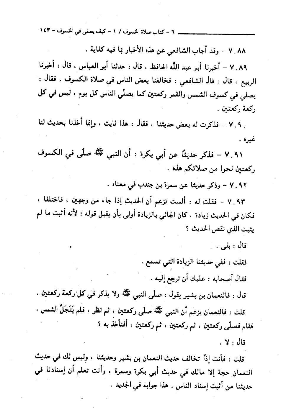 7093 - فَقُلْتُ لَهُ: أَلَسْتَ تَزْعُمُ أَنَّ الْحَدِيثَ إِذَا جَاءَ مِنْ وَجْهَيْنِ فَاخْتَلَفَا فَكَانَ فِي الْحَدِيثِ زِيَادَةٌ، كَانَ الْجَائِي بِالزِّيَادَةِ أَوْلَى بِأَنْ يُقْبَلَ قَوْلُهُ لِأَنَّهُ أَثْبَتَ مَا لَمْ يُثْبِتِ الَّذِي نَقَصَ الْحَدِيثَ؟ قَالَ: بَلَى، فَقُلْتُ: فَفِي حَدِيثِنَا الزِّيَادَةُ الَّتِي تَسْمَعُ فَقَالَ أَصْحَابُهُ: عَلَيْكَ أَنْ تَرْجِعَ إِلَيْهِ قَالَ: فَالنُّعْمانُ بْنُ بَشِيرٍ يَقُولُ: صَلَّى النَّبِيُّ صَلَّى اللهُ عَلَيْهِ وَسَلَّمَ وَلَا يَذْكُرُ فِي كُلِّ رَكْعَةٍ رَكْعَتَيْنِ قُلْتُ: فَالنُّعْمانُ يَزْعُمُ أَنَّ النَّبِيَّ صَلَّى اللهُ عَلَيْهِ وَسَلَّمَ صَلَّى رَكْعَتَيْنِ ثُمَّ نَظَرَ فَلَمْ يَتَجَلَّ الشَّمْسُ، فَقَامَ فَصَلَّى رَكْعَتَيْنِ، ثُمَّ رَكْعَتَيْنِ، ثُمَّ رَكْعَتَيْنِ، أَفَنَأْخُذُ بِهِ؟ قَالَ: لَا، قُلْتُ: فَأَنْتَ إِذًا تُخَالِفُ حَدِيثَ النُّعْمَانِ بْنِ بَشِيرٍ وَحَدِيثِنَا، وَلَيْسَ لَكَ فِي حَدِيثِ النُّعْمَانِ حُجَّةً إِلَّا مَالِكٍ فِي حَدِيثِ أَبِي بَكْرَةَ، وَسَمُرَةَ، وَأَنْتَ تَعْلَمُ أَنَّ إسْنَادَنَا فِي حَدِيثِنَا مِنْ أَثْبَتِ إِسْنَادِ النَّاسِ هَذَا جَوَابُهُ فِي الْجَدِيدِ -[144]-.