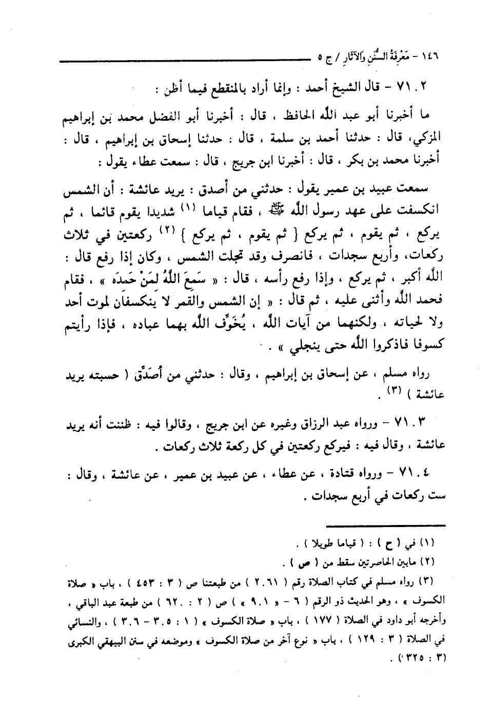 7102 - قَالَ الشَّيْخُ أَحْمَدُ: وَإِنَّمَا أَرَادَ بِالْمُنْقَطِعِ فِيمَا أَظُنُّ: مَا أَخْبَرَنَا أَبُو عَبْدِ اللَّهِ الْحَافِظُ قَالَ: أَخْبَرَنَا أَبُو الْفَضْلِ مُحَمَّدُ بْنُ إِبْرَاهِيمَ الْمُزَكِّي قَالَ: حَدَّثَنَا أَحْمَدُ بْنُ سَلَمَةَ قَالَ: حَدَّثَنَا إِسْحَاقُ بْنُ إِبْرَاهِيمَ قَالَ: أَخْبَرَنَا مُحَمَّدُ بْنُ بَكْرٍ قَالَ: أَخْبَرَنَا ابْنُ جُرَيْجٍ قَالَ: سَمِعْتُ عَطَاءً يَقُولُ: سَمِعْتُ عُبَيْدَ بْنَ عُمَيْرٍ يَقُولُ: حَدَّثَنِي مَنْ أُصَدِّقُ: يُرِيدُ عَائِشَةَ: أَنَّ الشَّمْسَ انْكَسَفَتْ عَلَى عَهْدِ رَسُولِ اللَّهِ صَلَّى اللهُ عَلَيْهِ وَسَلَّمَ، فَقَامَ قِيَامًا شَدِيدًا يَقُومُ قَائِمًا، ثُمَّ يَرْكَعُ، ثُمَّ يَقُومُ ثُمَّ يَرْكَعُ، ثُمَّ يَقُومُ، ثُمَّ يَرْكَعُ رَكْعَتَيْنِ فِي ثَلَاثِ رَكَعَاتٍ، وَأَرْبَعِ سَجَدَاتٍ، فَانْصَرَفَ وَقَدْ تَجَلَّتِ الشَّمْسُ، وَكَانَ إِذَا رَفَعَ قَالَ: اللَّهُ أَكْبَرُ، ثُمَّ يَرْكَعُ، وَإِذَا رَفَعَ رَأْسَهُ قَالَ: «سَمِعَ اللَّهُ لِمَنْ حَمِدَهُ» فَقَامَ فَحَمِدَ اللَّهَ وَأَثْنَى عَلَيْهِ، ثُمَّ قَالَ: «§إِنَّ الشَّمْسَ وَالْقَمَرَ لَا يَنْكَسِفَانِ لِمَوْتِ أَحَدٍ وَلَا لِحَيَاتِهِ، وَلَكِنَّهُمَا مِنْ آيَاتِ اللَّهِ، يُخَوِّفُ اللَّهُ بِهِمَا عِبَادَهُ، فَإِذَا رَأَيْتُمْ كُسُوفًا فَاذْكُرُوا اللَّهَ حَتَّى يَنْجَلِيَ» رَوَاهُ مُسْلِمٌ، عَنْ إِسْحَاقَ بْنِ إِبْرَاهِيمَ، وَقَالَ: حَدَّثَنِي مَنْ أُصَدِّقُ حَسِبْتُهُ يُرِيدُ عَائِشَةَ