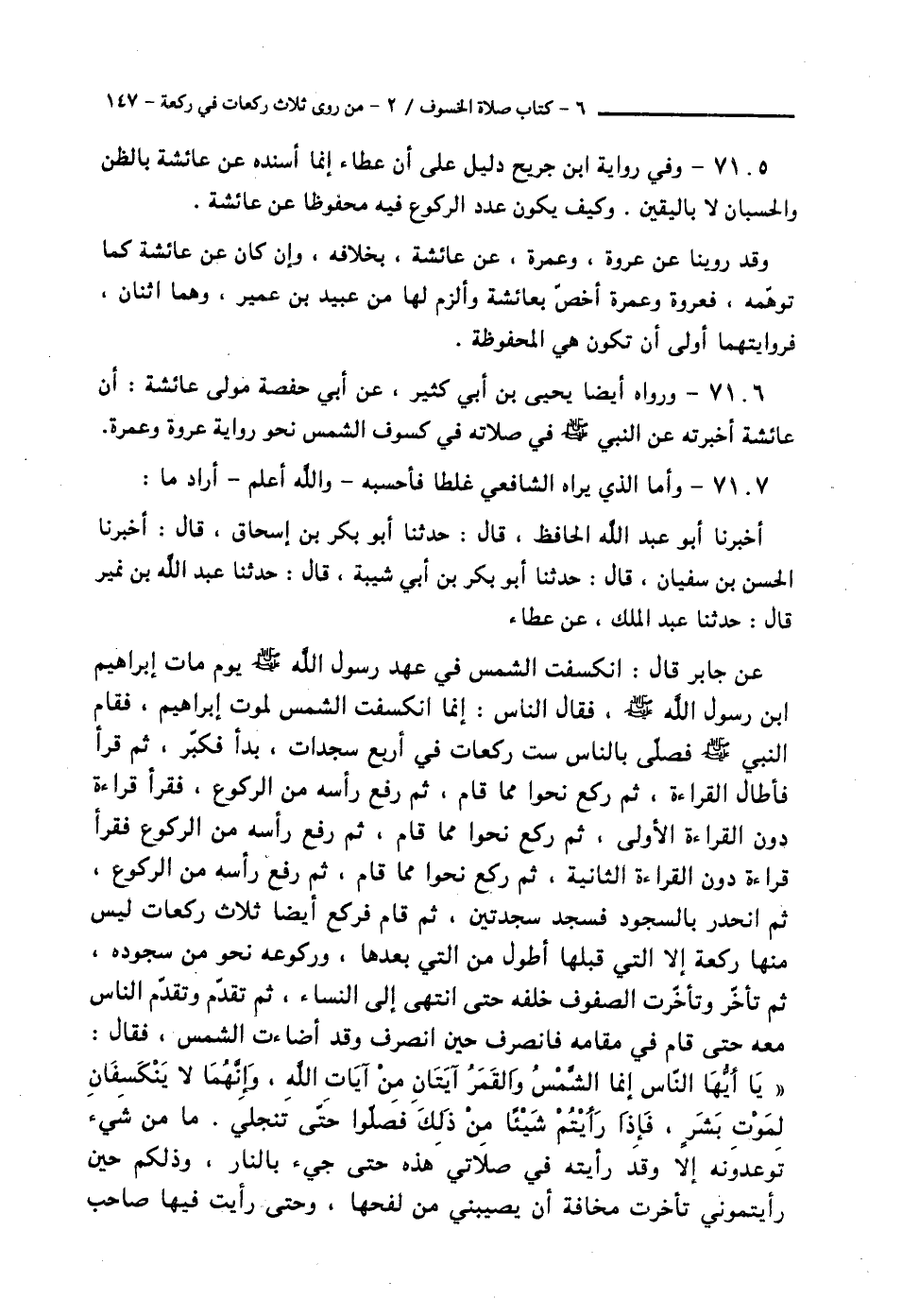 7107 - وَأَمَّا الَّذِي يَرَاهُ الشَّافِعِيُّ غَلَطًا فَأَحْسَبُهُ وَاللَّهُ أَعْلَمُ أَرَادَ مَا أَخْبَرَنَا أَبُو عَبْدِ اللَّهِ الْحَافِظُ قَالَ: حَدَّثَنَا أَبُو بَكْرِ بْنُ إِسْحَاقَ قَالَ: أَخْبَرَنَا الْحَسَنُ بْنُ سُفْيَانَ قَالَ: حَدَّثَنَا أَبُو بَكْرِ بْنُ أَبِي شَيْبَةَ قَالَ: حَدَّثَنَا عَبْدُ اللَّهِ بْنُ نُمَيْرٍ قَالَ: حَدَّثَنَا عَبْدُ الْمَلِكِ، عَنْ عَطَاءٍ عَنْ جَابِرٍ قَالَ: " انْكَسَفَتِ الشَّمْسُ فِي عَهْدِ رَسُولِ اللَّهِ صَلَّى اللهُ عَلَيْهِ وَسَلَّمَ يَوْمَ مَاتَ إِبْرَاهِيمُ ابْنُ رَسُولِ اللَّهِ صَلَّى اللهُ عَلَيْهِ وَسَلَّمَ فَقَالَ النَّاسُ: إِنَّمَا انْكَسَفَتِ الشَّمْسُ لِمَوْتِ إِبْرَاهِيمَ، فَقَامَ النَّبِيُّ صَلَّى اللهُ عَلَيْهِ وَسَلَّمَ فَصَلَّى بِالنَّاسِ سِتَّ رَكَعَاتٍ فِي أَرْبَعِ سَجَدَاتٍ، بَدَأَ فَكَبَّرَ، ثُمَّ قَرَأَ فَأَطَالَ الْقِرَاءَةَ، ثُمَّ رَكَعَ نَحْوًا مِمَّا قَامَ، ثُمَّ رَفَعَ رَأْسَهُ مِنَ الرُّكُوعِ فَقَرَأَ قِرَاءَةً دُونَ الْقِرَاءَةِ الْأُولَى، ثُمَّ رَكَعَ نَحْوًا مِمَّا قَامَ، ثُمَّ رَفَعَ رَأْسَهُ مِنَ الرُّكُوعِ فَقَرَأَ قِرَاءَةً دُونَ الْقِرَاءَةِ الثَّانِيَةِ، ثُمَّ رَكَعَ نَحْوًا مِمَّا قَامَ، ثُمَّ رَفَعَ رَأْسَهُ مِنَ الرُّكُوعِ، ثُمَّ انْحَدَرَ بِالسُّجُودِ فَسَجَدَ سَجْدَتَيْنِ، ثُمَّ قَامَ فَرَكَعَ أَيْضًا ثَلَاثَ رَكَعَاتٍ لَيْسَ مِنْهَا رَكْعَةٌ إِلَّا الَّتِي قَبْلَهَا أَطْوَلُ مِنَ الَّتِي بَعْدَهَا، وَرُكُوعُهُ نَحْوًا مِنْ سُجُودِهِ، ثُمَّ تَأَخَّرَ وَتَأَخَّرَتِ الصُّفُوفُ خَلْفَهُ حَتَّى انْتَهَى إِلَى النِّسَاءِ، ثُمَّ تَقَدَّمَ وَتَقَدَّمَ النَّاسُ مَعَهُ حَتَّى قَامَ فِي مَقَامِهِ فَانْصَرَفَ حِينَ انْصَرَفَ وَقَدْ أَضَاءَتِ الشَّمْسُ فَقَالَ: §" يَا أَيُّهَا النَّاسُ إِنَّمَا الشَّمْسُ وَالْقَمَرُ آيَتَانِ مِنْ آيَاتِ اللَّهِ، وَإِنَّهُمَا لَا يَنْكَسِفَانِ لِمَوْتِ بَشَرٍ، فَإِذَا رَأَيْتُمْ شَيْئًا مِنْ ذَلِكَ فَصَلُّوا حَتَّى تَنْجَلِيَ مَا مِنْ شَيْءٍ تُوعَدُونَهُ إِلَّا وَقَدْ رَأَيْتُهُ فِي صَلَاتِي هَذِهِ حَتَّى جِيءَ بِالنَّارِ، وَذَلِكُمْ حِينَ رَأَيْتُمُونِي تَأَخَّرْتُ مَخَافَةَ أَنْ يُصِيبَنِيَ مِنْ لَفْحِهَا، وَحَتَّى رَأَيْتُ فِيهَا صَاحِبَ -[148]- الْمِحْجَنِ يَجُرُّ قَصَبَهُ فِي النَّارِ، كَانَ يَسْرِقُ مَتَاعَ الْحَاجِّ بِمِحْجَنِهِ فَإِنْ فَطَنَ لَهُ قَالَ: إِنَّهُ تَعَلَّقَ بِمِحْجَنِي، وَإِنْ غَفَلَ عَنْهُ ذَهَبَ بِهِ، وَحَتَّى رَأَيْتُ فِيهَا صَاحِبَةَ الْهِرَّةِ الَّتِي رَبَطَتْهَا فَلَمْ تُطْعِمْهَا وَلَمْ تَدَعْهَا تَأْكُلُ مِنْ خَشَاشِ الْأَرْضِ حَتَّى مَاتَتْ جُوعًا ثُمَّ جِيءَ بِالْجَنَّةِ وَذَلِكُمْ حِينَ رَأَيْتُمُونِي تَقَدَّمْتُ حَتَّى قُمْتُ فِي مَقَامِي، وَلَقَدْ مَدَدْتُ يَدِي وَأَنَا أُرِيدُ أَنْ أَتَنَاوَلَ مِنْ ثَمَرِهَا لِتَنْظُرُوا إِلَيْهِ، ثُمَّ بَدَا لِي أَنْ لَا أَفْعَلَ فَمَا مِنْ شَيْءٍ تُوعَدُونَهُ إِلَّا وَقَدْ رَأَيْتُهُ فِي صَلَاتِي هَذِهِ " رَوَاهُ مُسْلِمٌ فِي الصَّحِيحِ عَنْ أَبِي بَكْرِ بْنِ أَبِي شَيْبَةَ