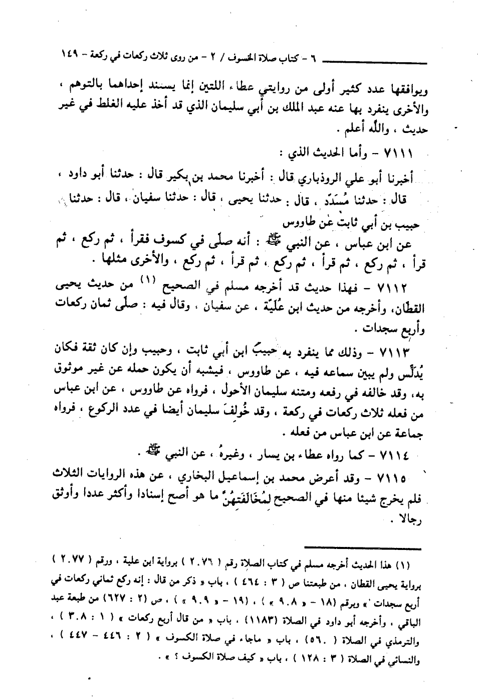 7111 - وَأَمَّا الْحَدِيثُ الَّذِي: أَخْبَرَنَا أَبُو عَلِيٍّ الرُّوذْبَارِيُّ قَالَ: أَخْبَرَنَا مُحَمَّدُ بْنُ بَكْرٍ قَالَ: حَدَّثَنَا أَبُو دَاوُدَ قَالَ: حَدَّثَنَا مُسَدَّدٌ قَالَ: حَدَّثَنَا يَحْيَى قَالَ: حَدَّثَنَا سُفْيَانُ قَالَ: حَدَّثَنَا حَبِيبُ بْنُ أَبِي ثَابِتٍ، عَنْ طَاوُسٍ، عَنِ ابْنِ عَبَّاسٍ، عَنِ النَّبِيِّ صَلَّى اللهُ عَلَيْهِ وَسَلَّمَ: «§أَنَّهُ صَلَّى فِي كُسُوفٍ فَقَرَأَ، ثُمَّ رَكَعَ، ثُمَّ قَرَأَ، ثُمَّ رَكَعَ، ثُمَّ قَرَأَ، ثُمَّ رَكَعَ، ثُمَّ قَرَأَ، ثُمَّ رَكَعَ، وَالْأُخْرَى مِثْلَهَا»