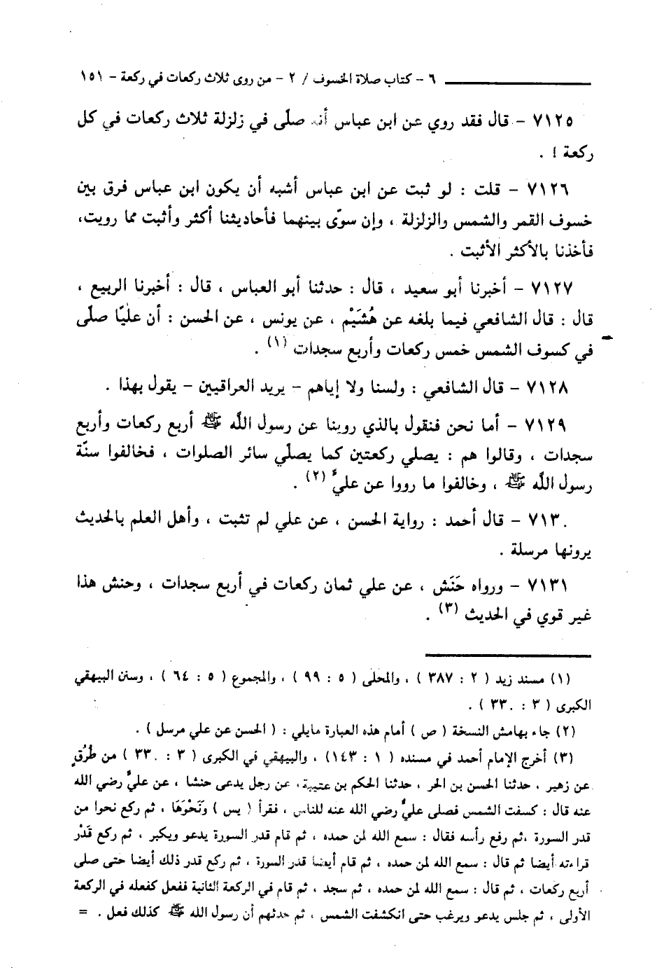 7135 - وَذَهَبَ جَمَاعَةٌ مِنْ أَهْلِ الْحَدِيثِ إِلَى تَصْحِيحِ الرِّوَايَاتِ فِي عَدَدِ الرَّكَعَاتِ وَحَمَلُوهَا عَلَى أَنَّ النَّبِيَّ صَلَّى اللهُ عَلَيْهِ وَسَلَّمَ فَعَلَهَا مَرَّاتٍ، وَأَنَّ الْجَمِيعَ جَائِزٌ.