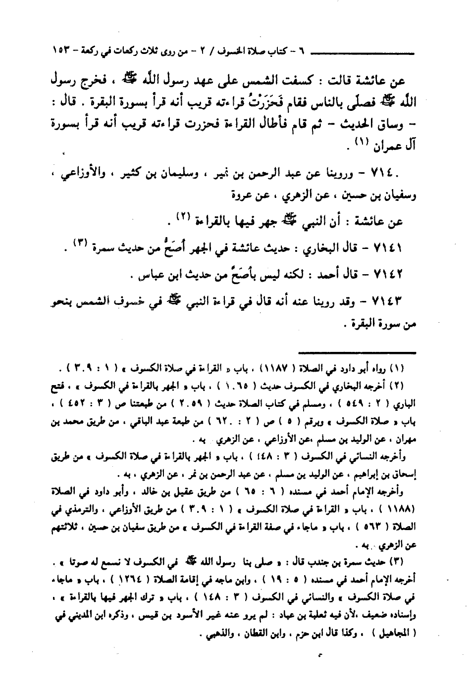 7143 - وَقَدْ رُوِّينَا عَنْهُ، أَنَّهُ قَالَ فِي قِرَاءَةِ النَّبِيِّ صَلَّى اللهُ عَلَيْهِ وَسَلَّمَ فِي خُسُوفِ الشَّمْسِ بِنَحْو مِنْ سُورَةِ الْبَقَرَةِ -[154]-
