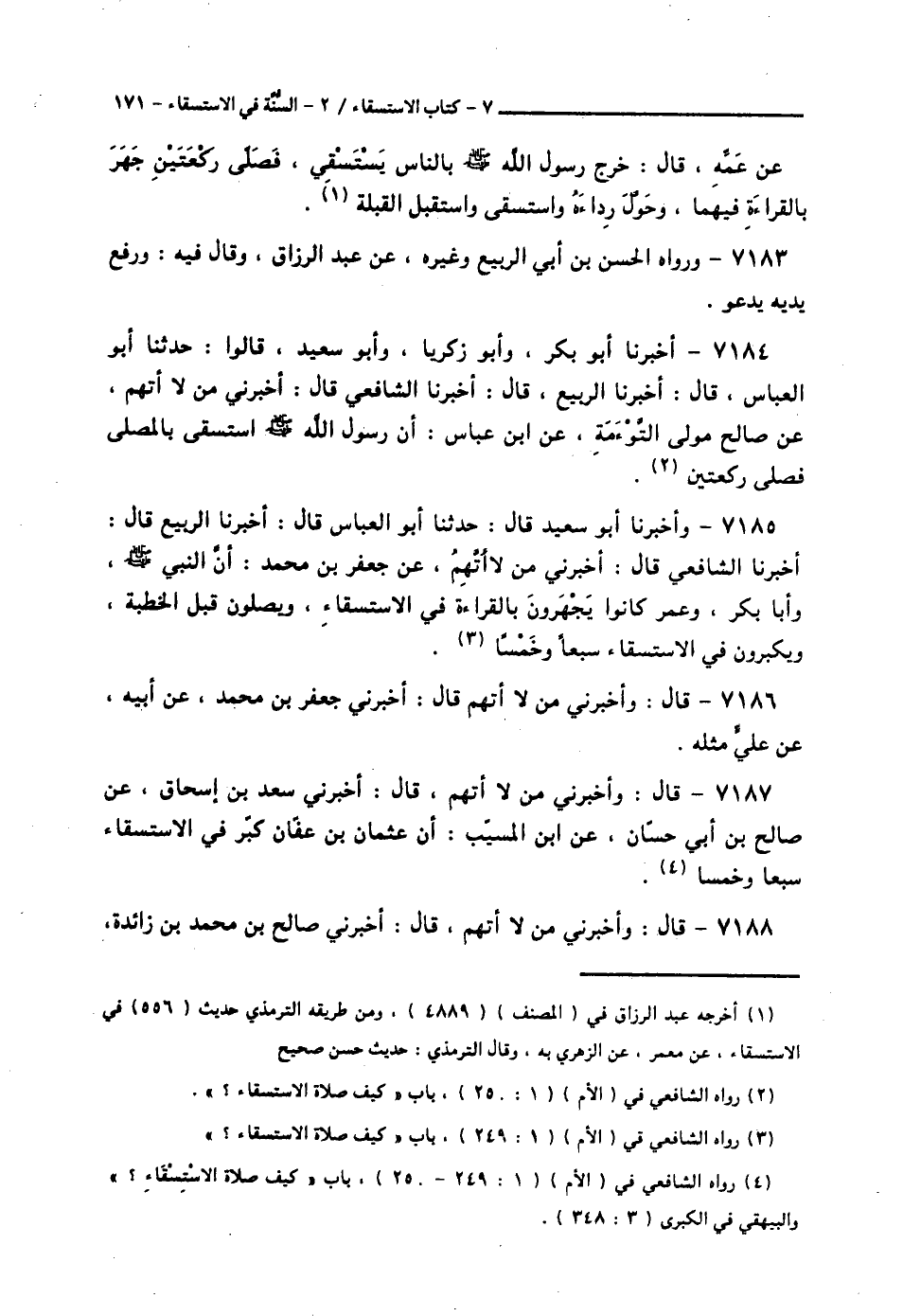 7184 - أَخْبَرَنَا أَبُو بَكْرٍ، وَأَبُو زَكَرِيَّا، وَأَبُو سَعِيدٍ، قَالُوا: حَدَّثَنَا أَبُو الْعَبَّاسِ قَالَ: أَخْبَرَنَا الرَّبِيعُ قَالَ: أَخْبَرَنَا الشَّافِعِيُّ قَالَ: أَخْبَرَنِي مَنْ، لَا أَتَّهِمُ عَنْ صَالِحٍ مَوْلَى التَّوْءَمَةِ، عَنِ ابْنِ عَبَّاسٍ، أَنَّ رَسُولَ اللَّهِ صَلَّى اللهُ عَلَيْهِ وَسَلَّمَ § «اسْتَسْقَى بِالْمُصَلَّى فَصَلَّى رَكْعَتَيْنِ»