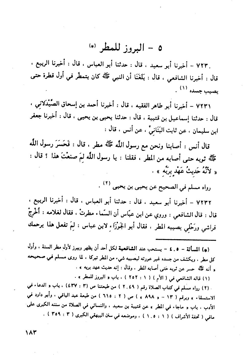7231 - أَخْبَرَنَا أَبُو طَاهِرٍ الْفَقِيهُ قَالَ: أَخْبَرَنَا أَحْمَدُ بْنُ إِسْحَاقَ الصَّيْدَلَانِيُّ قَالَ: حَدَّثَنَا إِسْمَاعِيلُ بْنُ قُتَيْبَةَ قَالَ: حَدَّثَنَا يَحْيَى بْنُ يَحْيَى قَالَ: أَخْبَرَنَا جَعْفَرُ بْنُ سُلَيْمَانَ، عَنْ ثَابِتٍ الْبُنَانِيِّ، عَنْ أَنَسٍ قَالَ: قَالَ أَنَسٌ: أَصَابَنَا وَنَحْنُ مَعَ رَسُولِ اللَّهِ صَلَّى اللهُ عَلَيْهِ وَسَلَّمَ مَطَرٌ قَالَ: فَحَسَرَ رَسُولُ اللَّهِ صَلَّى اللهُ عَلَيْهِ وَسَلَّمَ ثَوْبَهُ حَتَّى أَصَابَهُ مِنَ الْمَطَرِ فَقُلْنَا: يَا رَسُولَ اللَّهِ لِمَ صَنَعْتَ هَذَا؟ قَالَ: § «لِأَنَّهُ حَدِيثُ عَهْدٍ بِرَبِّهِ» رَوَاهُ مُسْلِمٌ فِي الصَّحِيحِ عَنْ يَحْيَى بْنِ يَحْيَى
