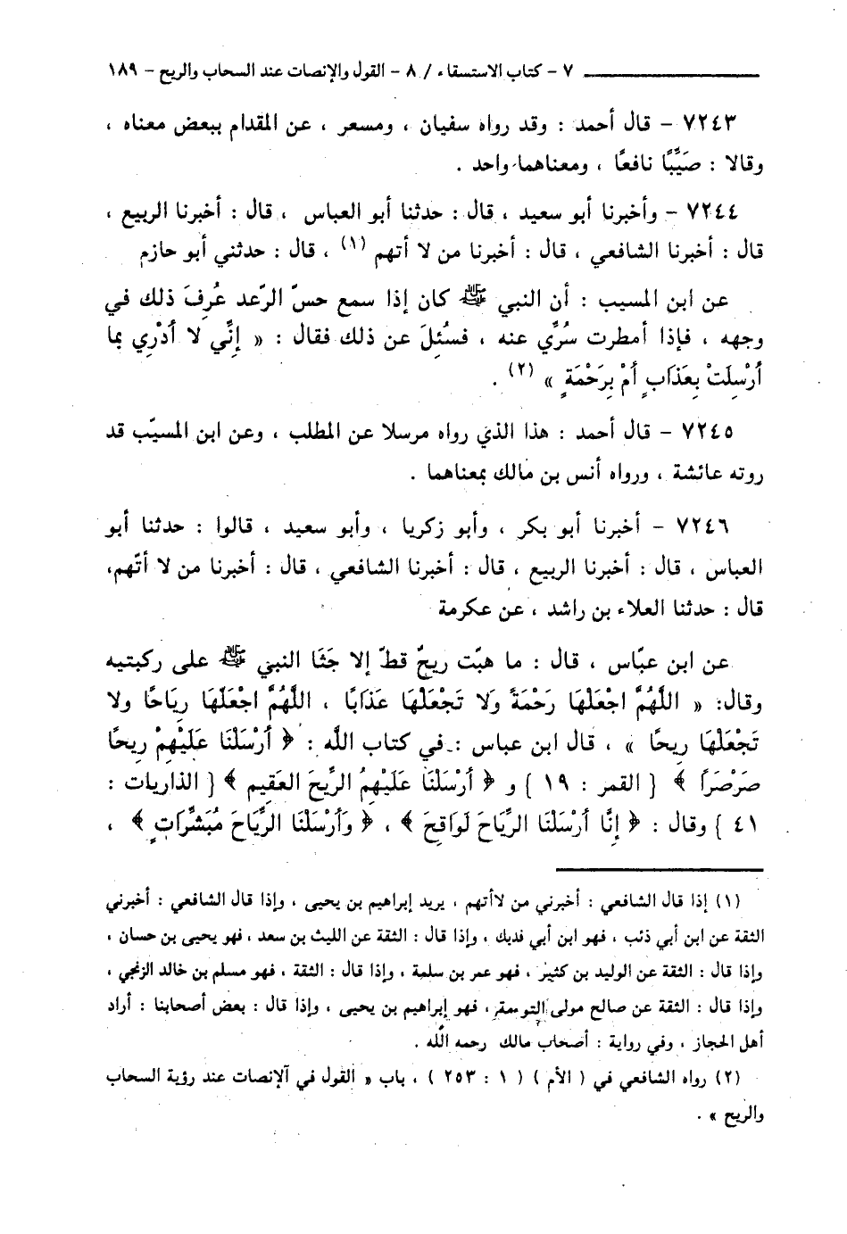 7246 - أَخْبَرَنَا أَبُو بَكْرٍ، وَأَبُو زَكَرِيَّا، وَأَبُو سَعِيدٍ قَالُوا: حَدَّثَنَا أَبُو الْعَبَّاسِ قَالَ: أَخْبَرَنَا الرَّبِيعُ قَالَ: أَخْبَرَنَا الشَّافِعِيُّ قَالَ: أَخْبَرَنَا مَنْ لَا أَتَّهِمُ قَالَ: حَدَّثَنَا الْعَلَاءُ بْنُ رَاشِدٍ، عَنْ عِكْرِمَةَ، عَنِ ابْنِ عَبَّاسٍ قَالَ: مَا هَبَّتْ رِيحٌ قَطُّ إِلَّا جَثَا النَّبِيُّ صَلَّى اللهُ عَلَيْهِ وَسَلَّمَ عَلَى رُكْبَتَيْهِ، وَقَالَ: «§اللَّهُمَّ اجْعَلْهَا رَحْمَةً وَلَا تَجْعَلْهَا عَذَابًا، اللَّهُمَّ اجْعَلْهَا رِيَاحًا وَلَا تَجْعَلْهَا رِيحًا» قَالَ ابْنُ عَبَّاسٍ: فِي كِتَابِ اللَّهِ {أَرْسَلْنَا عَلَيْهِمْ رِيحًا صَرْصَرًا} [القمر: 19] وَ {أَرْسَلْنَا عَلَيْهِمُ الرِّيحَ الْعَقِيمَ} [الذاريات: 41] وَقَالَ: «إِنَّا أَرْسَلْنَا الرِّيَاحَ لَوَاقِحَ»، «وَأَرْسَلْنَا الرِّيَاحَ مُبَشِّرَاتٍ» -[190]- وَصَوَابُهُ: {وَأَرْسَلْنَا الرِّيَاحَ لَوَاقِحَ} [الحجر: 22]، {وَمِنْ آيَاتِهِ أَنْ يُرْسِلَ الرِّيَاحَ مُبَشِّرَاتٍ} [الروم: 46] "