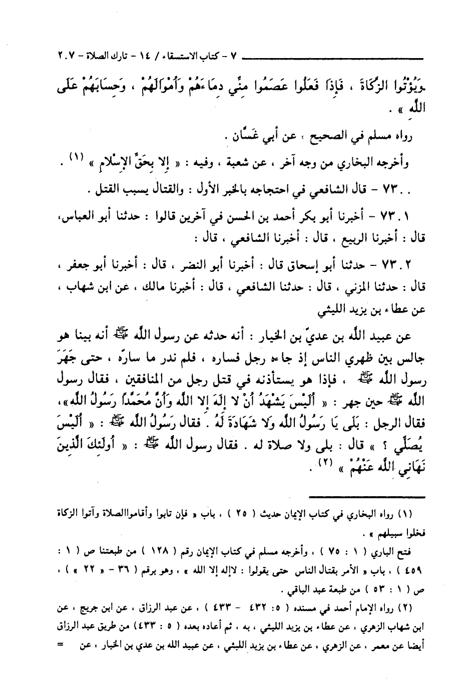 7302 - حَدَّثَنَا أَبُو إِسْحَاقَ قَالَ: أَخْبَرَنَا أَبُو النَّضْرِ قَالَ: أَخْبَرَنَا أَبُو جَعْفَرٍ قَالَ: حَدَّثَنَا الْمُزَنِيُّ قَالَ: حَدَّثَنَا الشَّافِعِيُّ قَالَ: أَخْبَرَنَا مَالِكٌ، عَنِ ابْنِ شِهَابٍ، عَنْ عَطَاءِ بْنِ يَزِيدَ اللَّيْثِيِّ، عَنْ عُبَيْدِ اللَّهِ بْنِ عَدِيِّ بْنِ الْخِيَارِ، أَنَّهُ حَدَّثَهُ عَنْ رَسُولِ اللَّهِ صَلَّى اللهُ عَلَيْهِ وَسَلَّمَ أَنَّهُ بَيْنَا هُوَ جَالِسٌ بَيْنَ ظَهْرِي النَّاسِ إِذَا جَاءَهُ رَجُلٌ فَسَارَّهُ، فَلَمْ نَدْرِ مَا سَارَّهُ، حَتَّى جَهَرَ رَسُولُ اللَّهِ صَلَّى اللهُ عَلَيْهِ وَسَلَّمَ فَإِذَا هُوَ يَسْتَأْذِنُهُ فِي قَتْلِ رَجُلٍ مِنَ الْمُنَافِقِينَ، فَقَالَ رَسُولُ اللَّهِ صَلَّى اللهُ عَلَيْهِ وَسَلَّمَ حِينَ جَهَرَ: «أَلَيْسَ يَشْهَدُ أَنْ لَا إِلَهَ إِلَّا اللَّهُ وَأَنَّ مُحَمَّدًا رَسُولُ اللَّهِ» فَقَالَ الرَّجُلُ: بَلَى يَا رَسُولَ اللَّهِ وَلَا شَهَادَةَ لَهُ فَقَالَ رَسُولُ اللَّهِ صَلَّى اللهُ عَلَيْهِ وَسَلَّمَ: «أَلَيْسَ يُصَلِّي؟» قَالَ: بَلَى، وَلَا صَلَاةَ لَهُ، فَقَالَ رَسُولُ اللَّهِ صَلَّى اللهُ عَلَيْهِ وَسَلَّمَ: «§أُولَئِكَ الَّذِينَ نَهَانِي اللَّهُ عَنْهُمْ» -[208]-