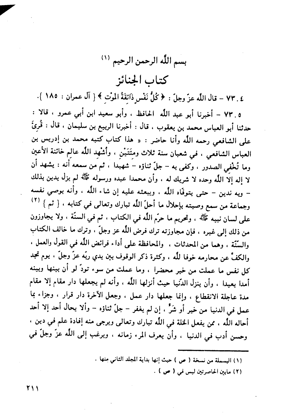 7305 - أَخْبَرَنَا أَبُو عَبْدِ اللَّهِ الْحَافِظُ، وَأَبُو سَعِيدِ بْنُ أَبِي عَمْرٍو قَالَا: حَدَّثَنَا أَبُو الْعَبَّاسِ مُحَمَّدُ بْنُ يَعْقُوبَ قَالَ: أَخْبَرَنَا الرَّبِيعُ بْنُ سُلَيْمَانَ قَالَ: قُرِئَ عَلَى الشَّافِعِيِّ رَحِمَهُ اللَّهُ وَأَنَا حَاضِرٌ: هَذَا كِتَابٌ كَتَبَهُ مُحَمَّدُ بْنُ إِدْرِيسَ بْنِ الْعَبَّاسِ الشَّافِعِيُّ فِي شَعْبَانَ سَنَةَ ثَلَاثٍ وَمِئَتَيْنِ، وَأُشْهِدُ اللَّهَ عَالِمَ خَائِنَةِ الْأَعْيُنِ وَمَا تُخْفِي الصُّدُورُ، وَكَفَى بِهِ جَلَّ ثَنَاؤُهُ شَهِيدًا، ثُمَّ مَنْ سَمِعَهُ أَنَّهُ: § «يَشْهَدُ أَنْ لَا إِلَهَ إِلَّا اللَّهُ وَحْدَهُ لَا شَرِيكَ لَهُ، وَأَنَّ مُحَمَّدًا عَبْدُهُ وَرَسُولُهُ صَلَّى اللهُ عَلَيْهِ وَسَلَّمَ لَمْ يَزَلْ يَدِينُ بِذَلِكَ - وَبِهِ نَدِينُ - حَتَّى يَتَوَفَّاهُ اللَّهُ، وَيَبْعَثَهُ عَلَيْهِ إِنْ شَاءَ اللَّهُ، وَأَنَّهُ يُوصِي نَفْسَهُ وَجَمَاعَةَ مَنْ سَمِعَ وَصِيَّتَهُ بِإحْلَالِ مَا أَحَلَّ اللَّهُ تَبَارَكَ وَتَعَالَى فِي كِتَابِهِ، ثُمَّ عَلَى لِسَانِ نَبِيِّهِ صَلَّى اللهُ عَلَيْهِ وَسَلَّمَ، وَتَحْرِيمِ مَا حَرَّمَ اللَّهُ فِي الْكِتَابِ، ثُمَّ فِي السُّنَّةِ، وَلَا يُجَاوِزُونَ مِنْ ذَلِكَ إِلَى غَيْرِهِ، فَإِنَّ مُجَاوَزَتَهُ تَرْكُ فَرَضِ اللَّهِ عَزَّ وَجَلَّ، وَتَرْكُ مَا خَالَفَ الْكِتَابَ وَالسُّنَّةَ، وَهُمَا مِنَ الْمُحْدَثَاتِ، وَالْمُحَافَظَةُ عَلَى أَدَاءِ فَرَائِضِ اللَّهِ فِي الْقَوْلِ وَالْعَمَلِ، وَالْكَفِّ عَنْ مَحَارِمِهِ خَوْفًا لِلَّهِ، وَكَثْرَةُ ذِكْرِ الْوقُوفِ بَيْنَ يَدَيْ رَبِّهِ عَزَّ وَجَلَّ، يَوْمَ تَجِدُ كُلُّ نَفْسٍ مَا عَمِلَتْ مِنْ خَيْرٍ مُحْضَرًا، وَمَا عَمِلَتْ مِنْ سُوءٍ تَوَدُّ لَوْ أَنَّ بَيْنَهَا وَبَيْنَهُ أَمَدًا بَعِيدًا، وَأَنْ يُنْزِلَ الدُّنْيَا حَيْثُ أَنْزَلَهَا اللَّهُ، وَأَنَّهُ لَمْ يَجْعَلْهَا دَارَ مَقَامٍ إِلَّا مَقَامَ مُدَّةٍ عَاجِلَةِ الِانْقِطَاعِ، وَإِنَّمَا جَعَلَهَا دَارَ عَمَلٍ، وَجَعَلَ الْآخِرَةَ دَارَ قَرَارٍ، وَجَزَاءٍ بِمَا عَمِلَ فِي الدُّنْيَا مِنْ خَيْرٍ أَوْ شَرٍّ، إِنْ لَمْ يَغْفِرْ جَلَّ ثَنَاؤُهُ وَأَلَّا يُحَالَ أَحَدٌ إِلَّا أَحَدٌ أَحَالَهُ اللَّهُ مِمَّنْ يَفْعَلُ الْخُلَّةَ فِي اللَّهِ تَبَارَكَ وَتَعَالَى وَيُرْجَى مِنْهُ إِفَادَةُ عِلْمٍ فِي دِينٍ، وَحُسْنُ أَدَبٍ فِي الدُّنْيَا، وَأَنْ يَعْرِفَ الْمَرْءُ زَمَانَهُ، وَيَرْغَبُ إِلَى اللَّهِ عَزَّ وَجَلَّ فِي -[212]- الْخَلَاصِ مِنْ شَرِّ نَفْسِهِ فِيهِ، وَيُمْسِكُ الْإِسْرَافَ بِقَوْلٍ أَوْ فِعْلٍ فِي أَمْرٍ لَا يَلْزَمْهُ وَأَنْ يُخْلِصَ النِّيَّةَ لِلَّهِ فِيمَا قَالَ وَعَمِلَ، فَإِنَّ اللَّهَ يَكْفِي مِمَّا سِوَاهُ، وَلَا يَكْفِي مِنْهُ شَيْءٌ غَيْرُهُ، ثُمَّ ذَكَرَ وَصِيَّتَهُ»