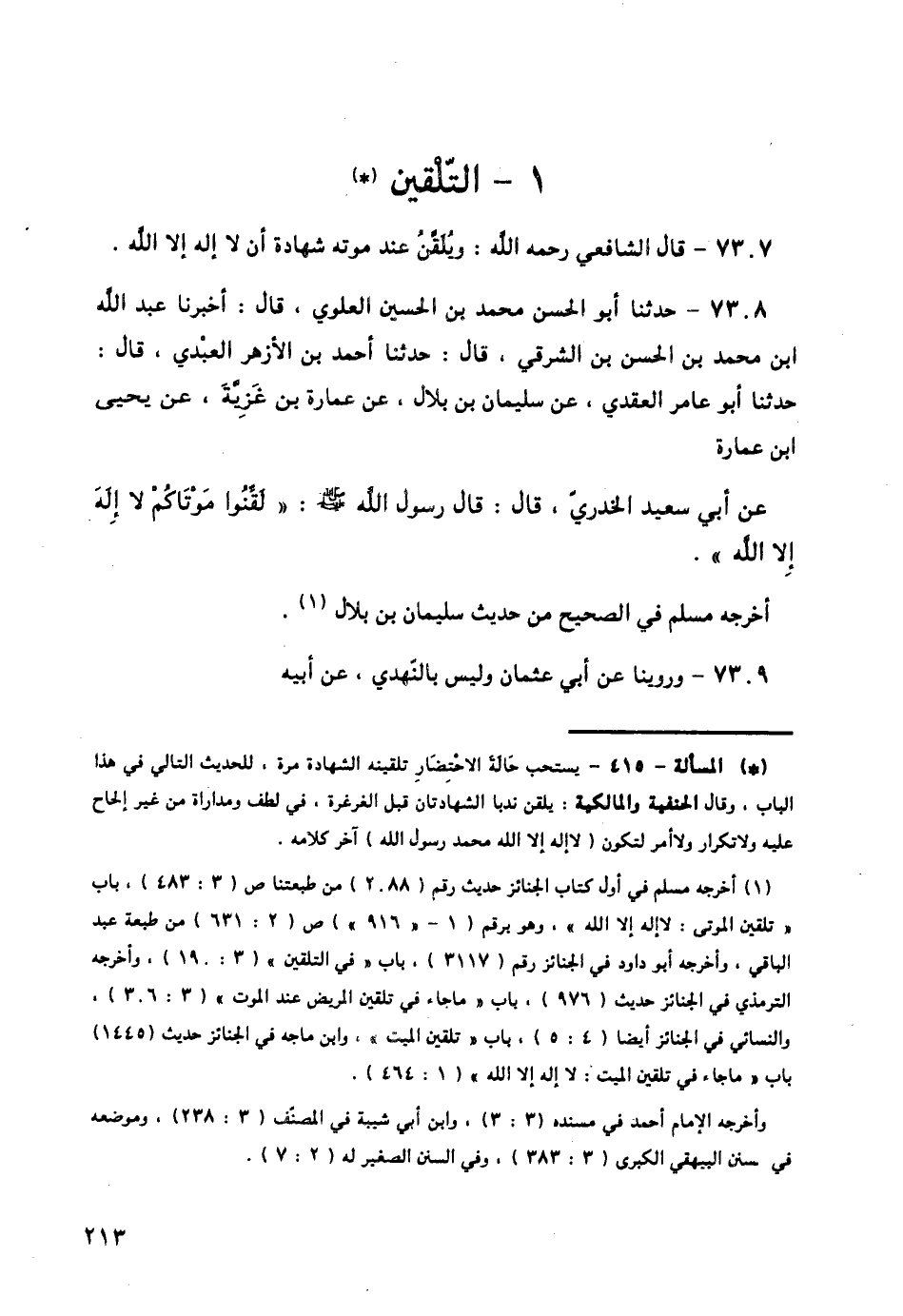7308 - حَدَّثَنَا أَبُو الْحَسَنِ مُحَمَّدُ بْنُ الْحُسَيْنِ الْعَلَوِيُّ قَالَ: أَخْبَرَنَا عَبْدُ اللَّهِ بْنُ مُحَمَّدِ بْنِ الْحَسَنِ بْنِ الشَّرْقِيِّ قَالَ: حَدَّثَنَا أَحْمَدُ بْنُ الْأَزْهَرِ الْعَبْدِيُّ قَالَ: حَدَّثَنَا أَبُو عَامِرٍ الْعَقَدِيُّ، عَنْ سُلَيْمَانَ بْنِ بِلَالٍ، عَنْ عُمَارَةَ بْنِ غَزِيَّةَ، عَنْ يَحْيَى بْنِ عُمَارَةَ، عَنْ أَبِي سَعِيدٍ الْخُدْرِيِّ قَالَ: قَالَ رَسُولُ اللَّهِ صَلَّى اللهُ عَلَيْهِ وَسَلَّمَ: § «لَقِّنُوا مَوْتَاكُمْ لَا إِلَهَ إِلَّا اللَّهُ» أَخْرَجَهُ مُسْلِمٌ فِي الصَّحِيحِ مِنْ حَدِيثِ سُلَيْمَانَ بْنِ بِلَالٍ