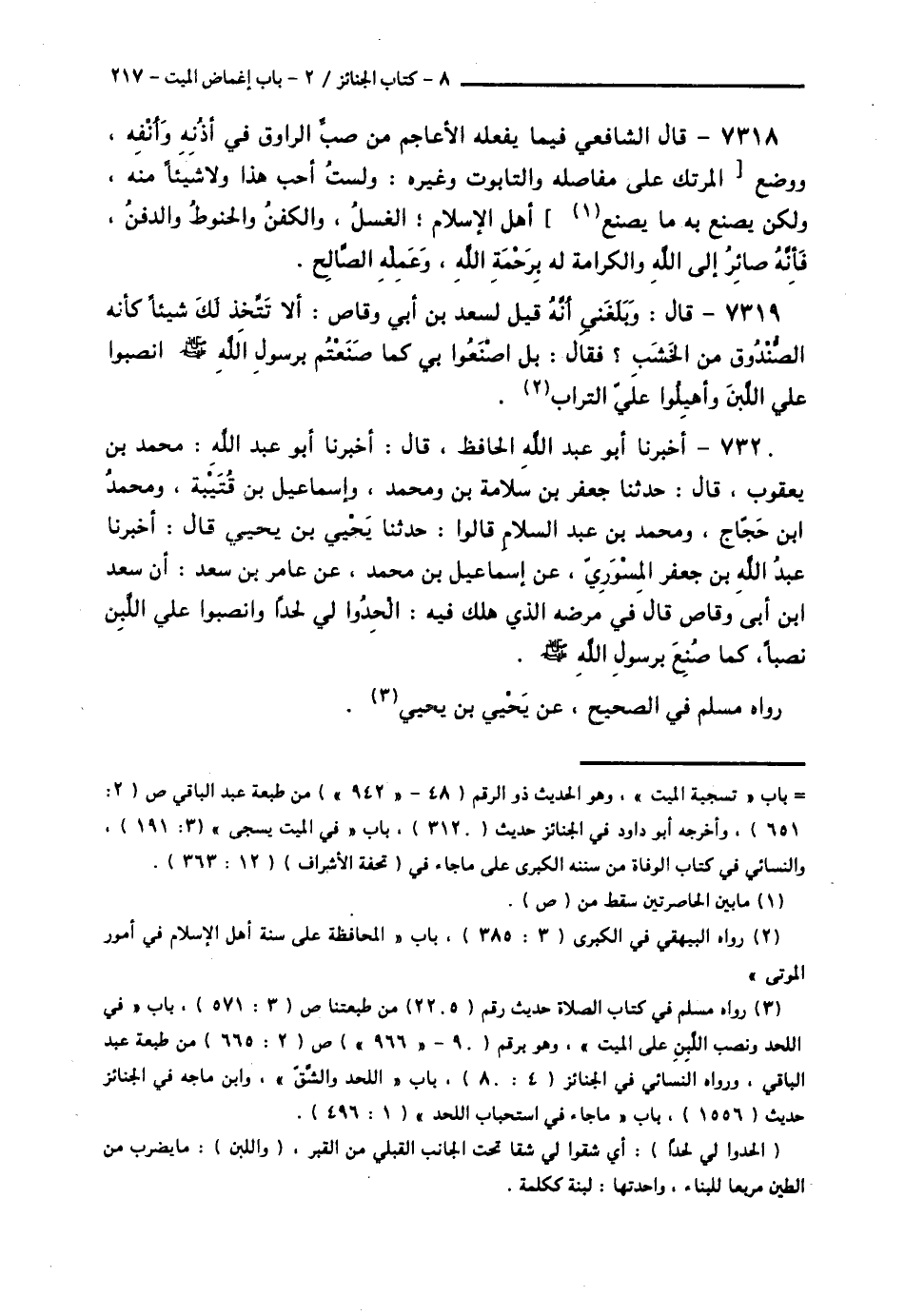 7320 - أَخْبَرَنَا أَبُو عَبْدِ اللَّهِ الْحَافِظُ قَالَ: أَخْبَرَنَا أَبُو عَبْدِ اللَّهِ مُحَمَّدُ بْنُ يَعْقُوبَ قَالَ: حَدَّثَنَا جَعْفَرُ بْنُ سَلَامَةَ بْنِ مُحَمَّدٍ، وَإِسْمَاعِيلُ بْنُ قُتَيْبَةَ، وَمُحَمَّدُ بْنُ حَجَّاجٍ، وَمُحَمَّدُ بْنُ عَبْدِ السَّلَامِ، قَالُوا: حَدَّثَنَا يَحْيَى بْنُ يَحْيَى قَالَ: أَخْبَرَنَا عَبْدُ اللَّهِ بْنُ جَعْفَرٍ الْمِسْوَرِيُّ، عَنْ إِسْمَاعِيلَ بْنِ مُحَمَّدٍ، عَنْ عَامِرِ بْنِ سَعْدٍ، أَنَّ سَعْدَ بْنَ أَبِي وَقَّاصٍ قَالَ فِي مَرَضِهِ الَّذِي هَلَكَ فِيهِ: § «الْحِدُوا لِي لَحْدًا وَانْصِبُوا عَلَيَّ اللَّبِنَ نَصْبًا كَمَا صُنِعَ بِرَسُولِ اللَّهِ صَلَّى اللهُ عَلَيْهِ وَسَلَّمَ» رَوَاهُ مُسْلِمٌ فِي الصَّحِيحِ، عَنْ يَحْيَى بْنِ يَحْيَى