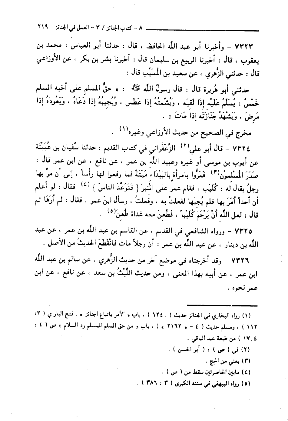 7323 - وَأَخْبَرَنَا أَبُو عَبْدِ اللَّهِ الْحَافِظُ قَالَ: حَدَّثَنَا أَبُو الْعَبَّاسِ مُحَمَّدُ بْنُ يَعْقُوبَ قَالَ: أَخْبَرَنَا الرَّبِيعُ بْنُ سُلَيْمَانَ قَالَ: أَخْبَرَنَا بِشْرُ بْنُ بَكْرٍ، عَنِ الْأَوْزَاعِيِّ قَالَ: حَدَّثَنِي الزُّهْرِيُّ، عَنْ سَعِيدِ بْنِ الْمُسَيِّبِ قَالَ: حَدَّثَنِي أَبُو هُرَيْرَةَ قَالَ: قَالَ رَسُولُ اللَّهِ صَلَّى اللهُ عَلَيْهِ وَسَلَّمَ: " §حَقُّ الْمُسْلِمِ عَلَى أَخِيهِ الْمُسْلِمِ خَمْسٌ: يُسَلِّمُ عَلَيْهِ إِذَا لَقِيَهُ، وَيُشَمِّتُهُ إِذَا عَطَسَ، وَيُجِيبُهُ إِذَا دَعَاهُ، وَيَعُودُهُ إِذَا مَرِضَ، وَيَشْهَدُ جِنَازَتَهُ إِذَا مَاتَ " مُخَرَّجٌ فِي الصَّحِيحِ مِنْ حَدِيثِ الْأَوْزَاعِيِّ وَغَيْرِهِ